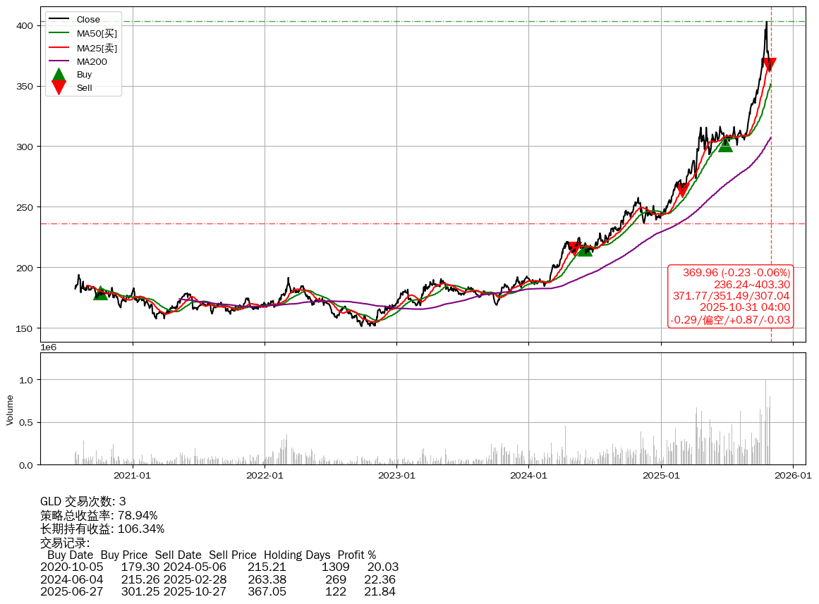 | 28 | ★GLD | $368.12(-1.99 -0.54% 2025-10-31 14:59) | 📉回撤 2025-10-20 -8.19% (10天) 363.00(2025-10-28) → 402.95(2025-10-19) (-9.92%) | +78.94% | +106.34% | -27.39% | 3 | 偏空/0.87/-0.03 | 2020-07-27~2025-10-31 |