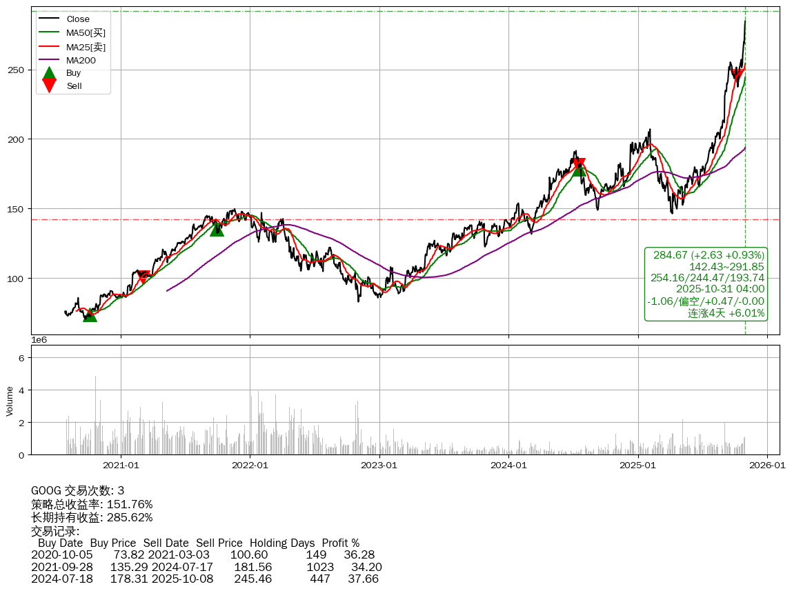 | 19 | ★GOOG | $281.92(+0.10 +0.04% 2025-10-31 14:59) | 📈连涨4天 +6.01% | +151.76% | +285.62% | -133.86% | 3 | 偏空/0.47/-0.00 | 2020-07-27~2025-10-31 |