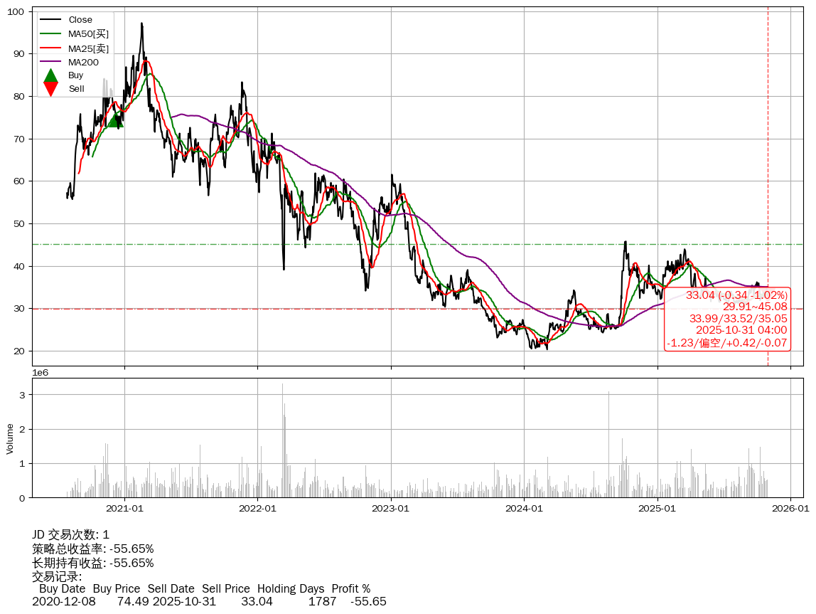| 38 | ★JD | $33.04(-0.34 -1.02% 2025-10-31 14:59) | 📉回撤 2021-02-17 -66.01% (1715天) 20.26(2024-03-04) → 97.21(2021-02-16) (-79.16%) | -55.65% | -55.65% | -0.00% | 1 | 偏空/0.42/-0.07 | 2020-07-27~2025-10-31 |