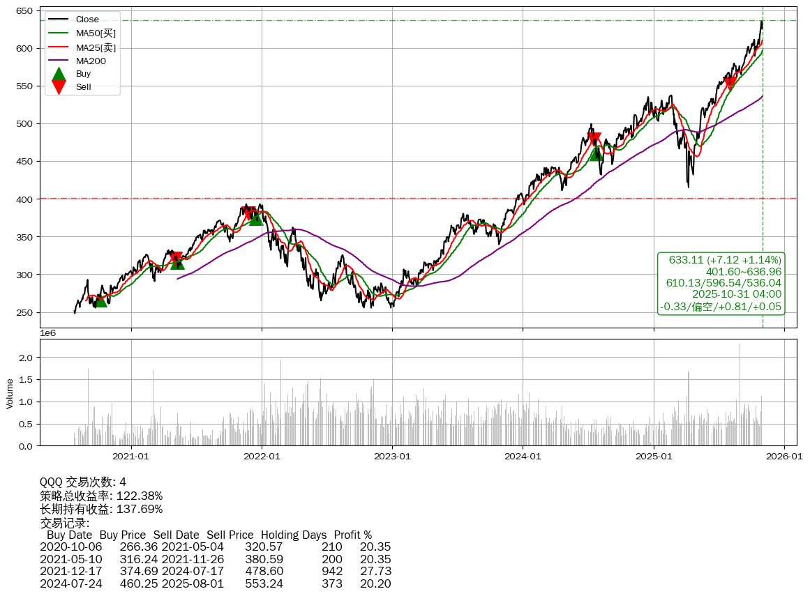 | 24 | ★QQQ | $629.21(+3.21 +0.51% 2025-10-31 14:59) | 📈涨破 MA5 均线 📉回撤 2025-10-29 -0.43% (1天) 625.99(2025-10-29) → 635.87(2025-10-28) (-1.55%) | +122.38% | +137.69% | -15.31% | 4 | 偏空/0.81/0.05 | 2020-07-27~2025-10-31 |