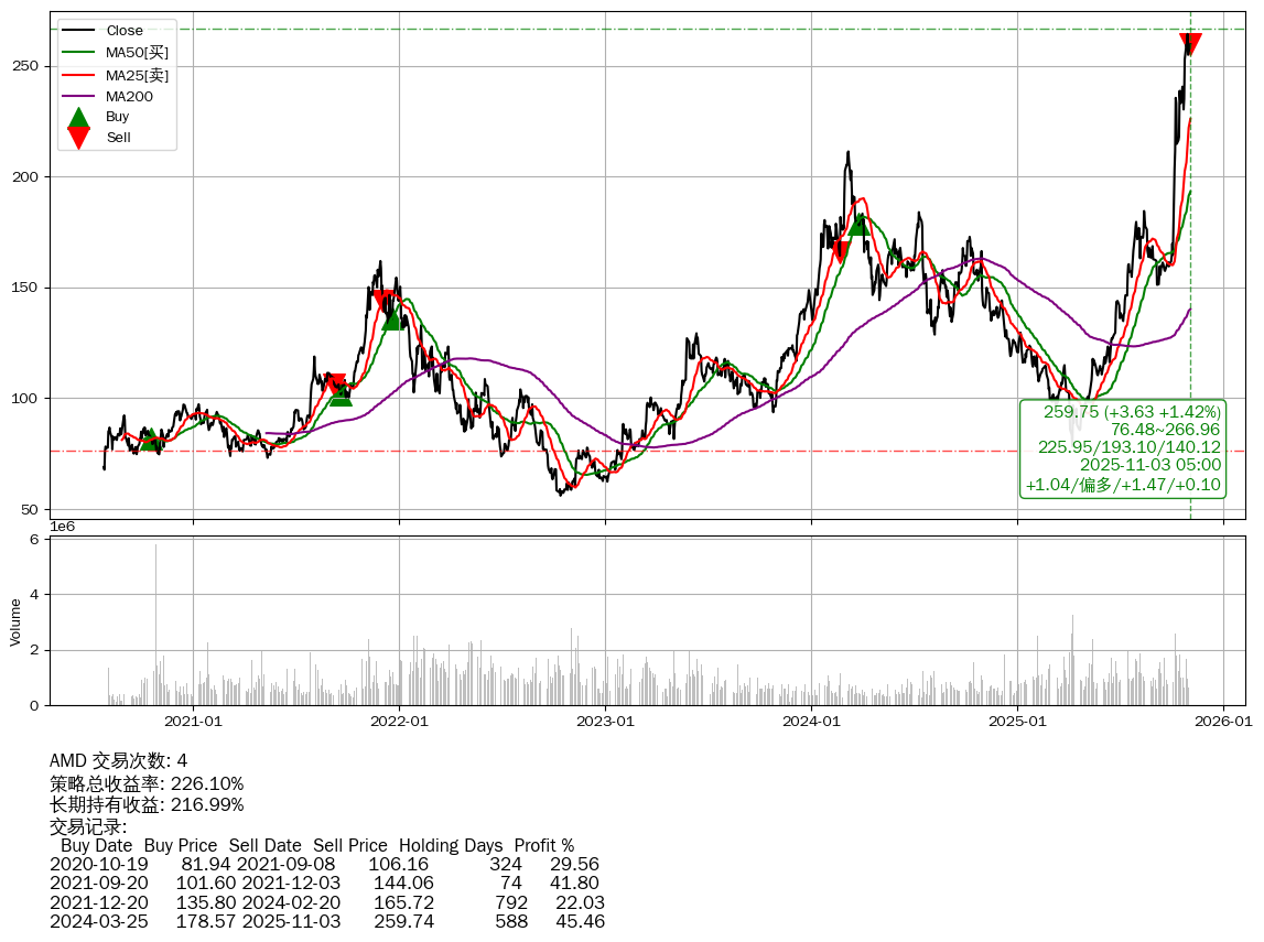 | 12 | ★AMD | $259.66(+3.60 +1.41% 2025-11-03 14:59) | 📈涨破 MA5 均线 📉回撤 2025-10-29 -1.73% (4天) 254.91(2025-10-29) → 264.31(2025-10-28) (-3.56%) | +226.10% | +216.99% | +9.11% | 4 | 偏多/1.46/0.10 | 2020-07-27~2025-11-03 |