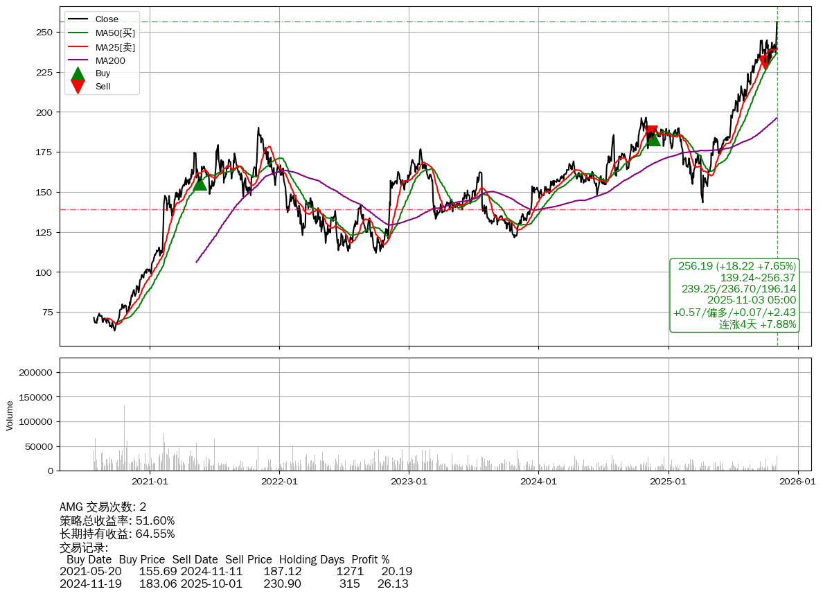 | 37 | 🟢AMG | $256.80(+19.04 +8.01% 2025-11-03 14:59) | 📈涨破 MA5/10/25 均线 📈涨破 52周高点 (256.37) 📈连涨4天 +7.88% | +51.60% | +64.55% | -12.96% | 2 | 偏多/0.07/2.43 | 2020-07-27~2025-11-03 |
