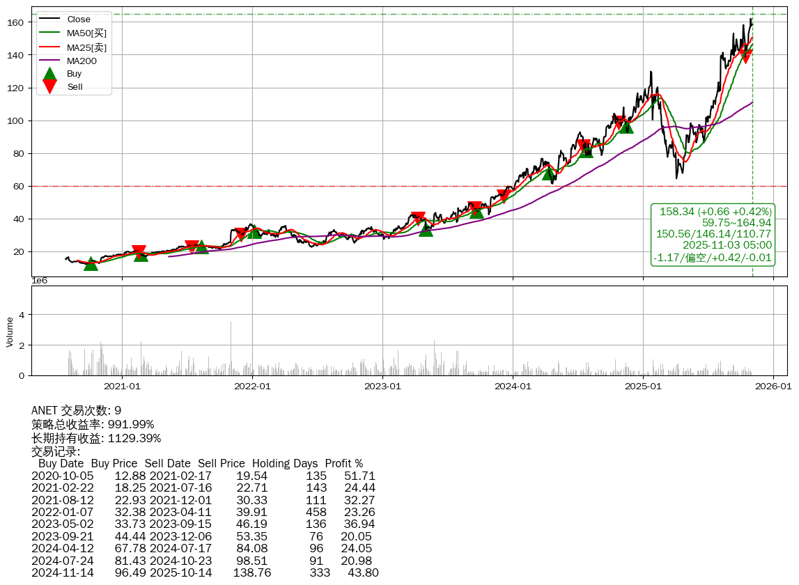 | 2 | ★ANET | $157.61(-0.13 -0.08% 2025-11-03 14:59) | 📉回撤 2025-10-29 -2.25% (4天) 157.68(2025-10-30) → 161.99(2025-10-28) (-2.66%) | +991.99% | +1129.39% | -137.39% | 9 | 偏空/0.42/-0.01 | 2020-07-27~2025-11-03 |