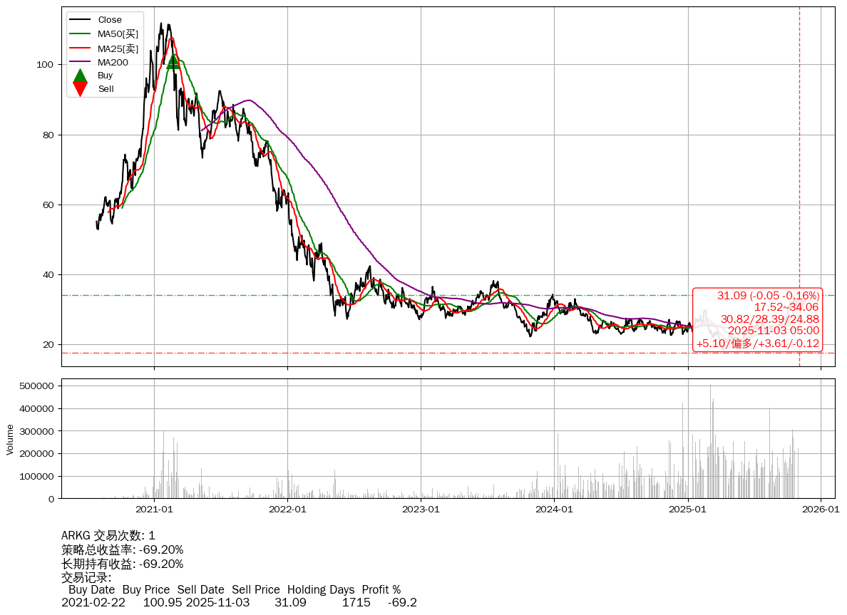 | 44 | ★ARKG | $30.67(-0.45 -1.45% 2025-11-03 14:59) | 📉回撤 2021-01-20 -72.19% (1747天) 18.35(2025-04-07) → 111.81(2021-01-19) (-83.59%) | -69.20% | -69.20% | +0.00% | 1 | 偏多/3.61/-0.12 | 2020-07-27~2025-11-03 |