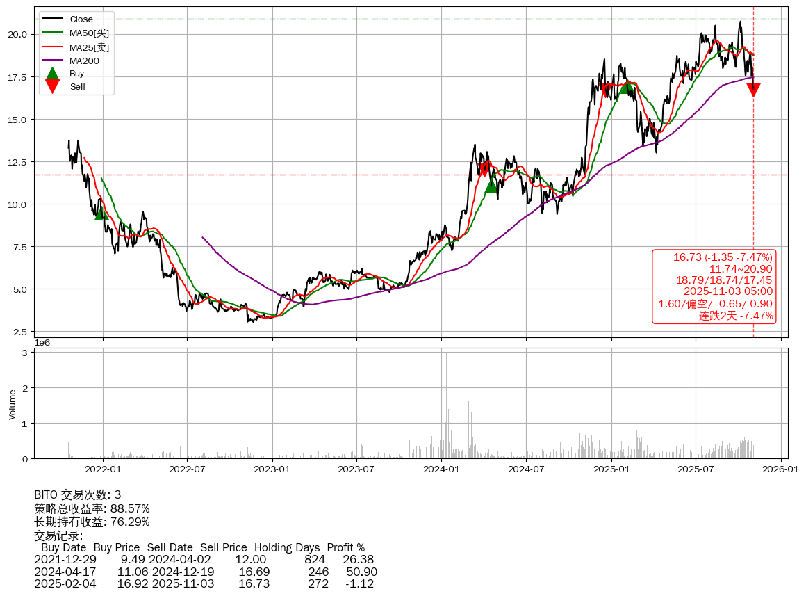 | 28 | 🟢BITO | $16.74(-1.33 -7.36% 2025-11-03 14:59) | 📉跌破 MA5/10/200 均线 📉连跌2天 -7.47% 📉回撤 2025-10-06 -19.37% (27天) 16.73(2025-11-02) → 20.75(2025-10-05) (-19.37%) | +88.57% | +76.29% | +12.28% | 3 | 偏空/0.65/-0.90 | 2021-10-19~2025-11-03 |