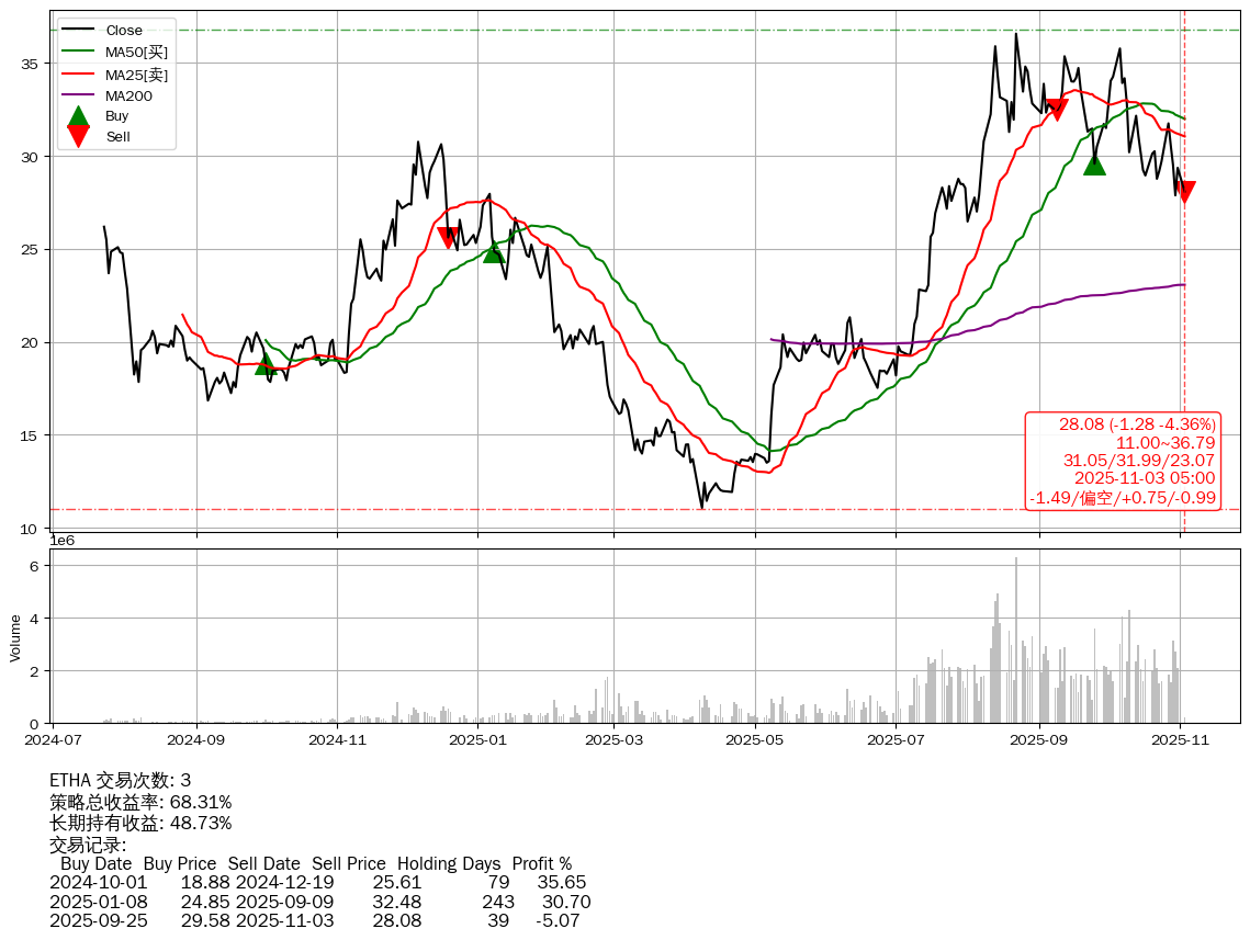 | 34 | ★ETHA | $27.10(-2.26 -7.70% 2025-11-03 14:59) | 📉跌破 MA5/100 均线 📉回撤 2025-08-24 -23.24% (70天) 27.88(2025-10-29) → 36.58(2025-08-21) (-23.78%) | +68.31% | +48.73% | +19.58% | 3 | 偏空/0.75/-0.99 | 2024-07-23~2025-11-03 |