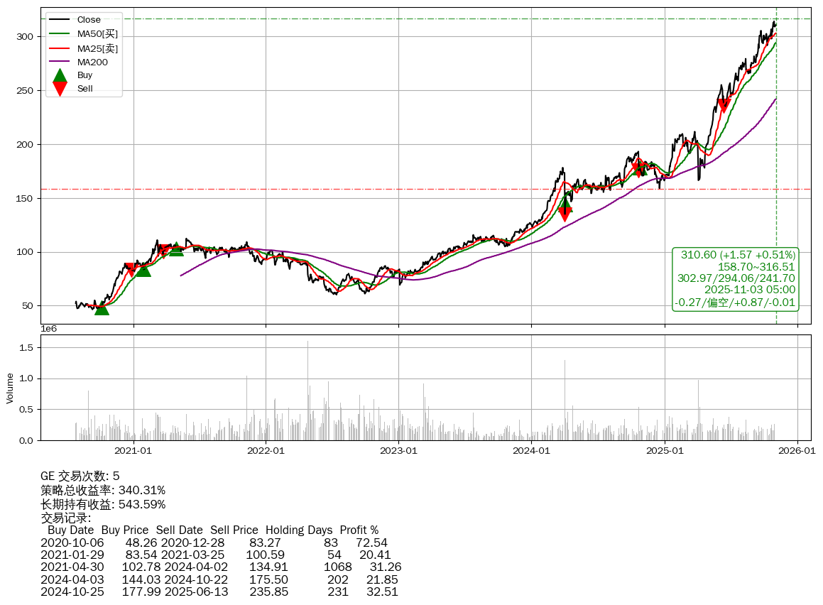 | 6 | ★GE | $308.70(-0.27 -0.09% 2025-11-03 14:59) | 📉回撤 2025-10-29 -1.10% (4天) 309.03(2025-10-30) → 314.04(2025-10-28) (-1.59%) | +340.31% | +543.59% | -203.28% | 5 | 偏空/0.87/-0.01 | 2020-07-27~2025-11-03 |