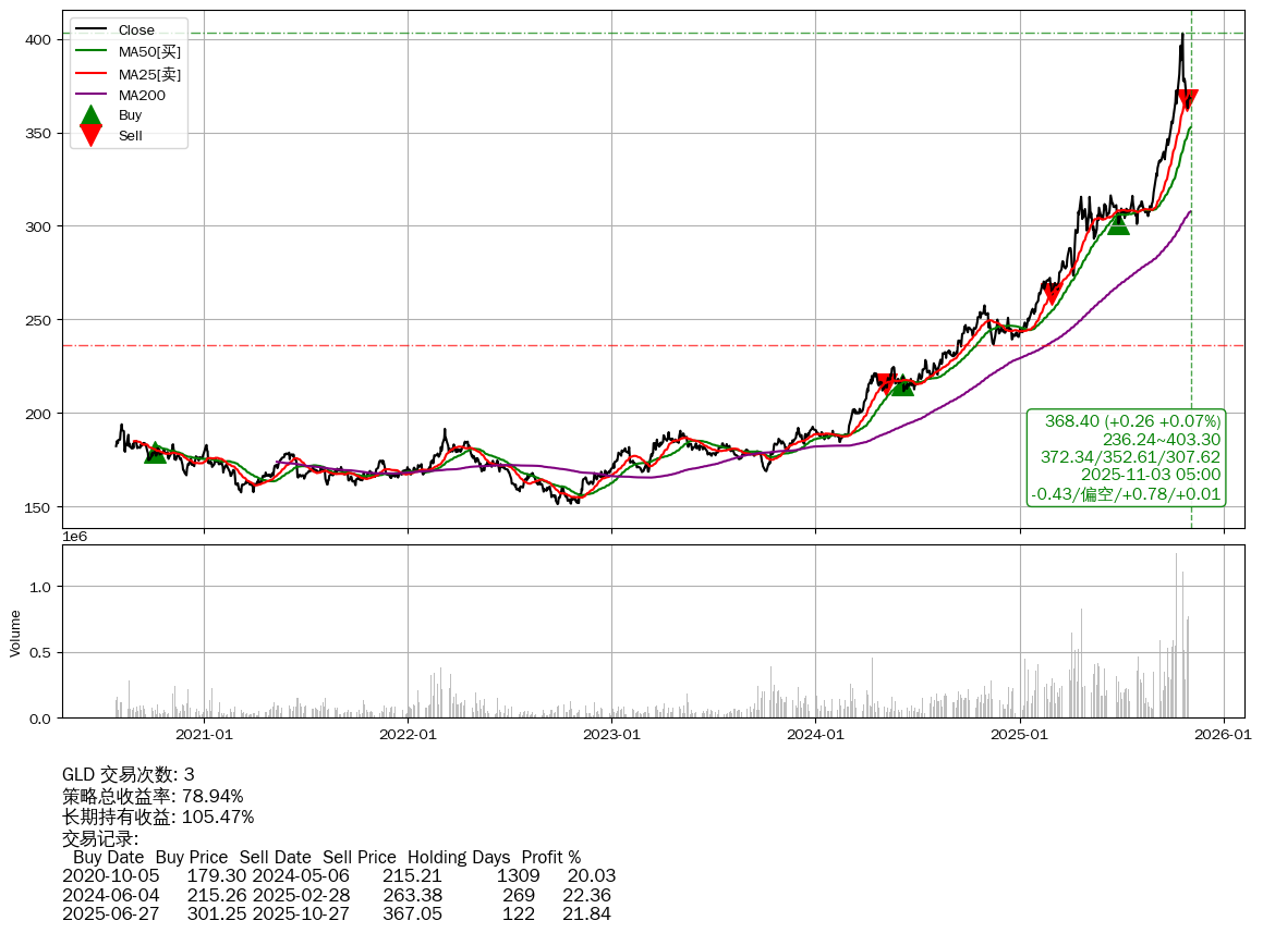 | 31 | ★GLD | $368.87(+0.75 +0.20% 2025-11-03 14:59) | 📉回撤 2025-10-20 -8.58% (13天) 363.00(2025-10-28) → 402.95(2025-10-19) (-9.92%) | +78.94% | +105.47% | -26.52% | 3 | 偏空/0.78/0.01 | 2020-07-27~2025-11-03 |