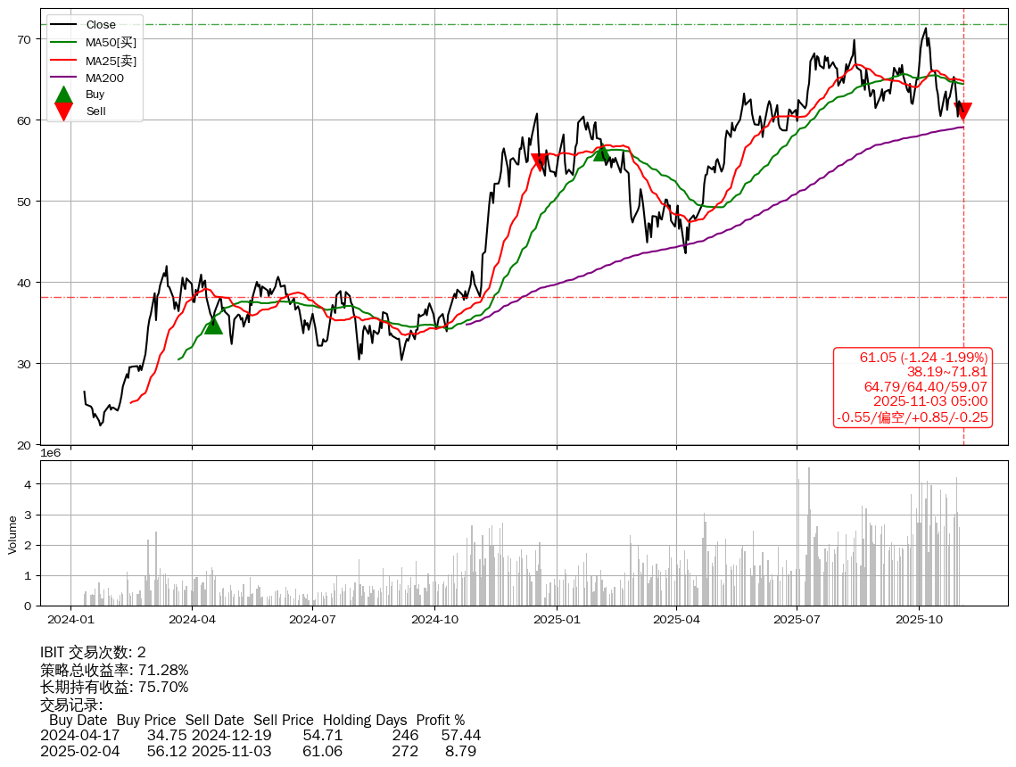 | 33 | ★IBIT | $60.54(-1.75 -2.81% 2025-11-03 14:59) | 📉跌破 MA5 均线 📉回撤 2025-10-06 -14.36% (27天) 60.40(2025-10-29) → 71.29(2025-10-05) (-15.28%) | +71.28% | +75.70% | -4.42% | 2 | 偏空/0.85/-0.25 | 2024-01-11~2025-11-03 |