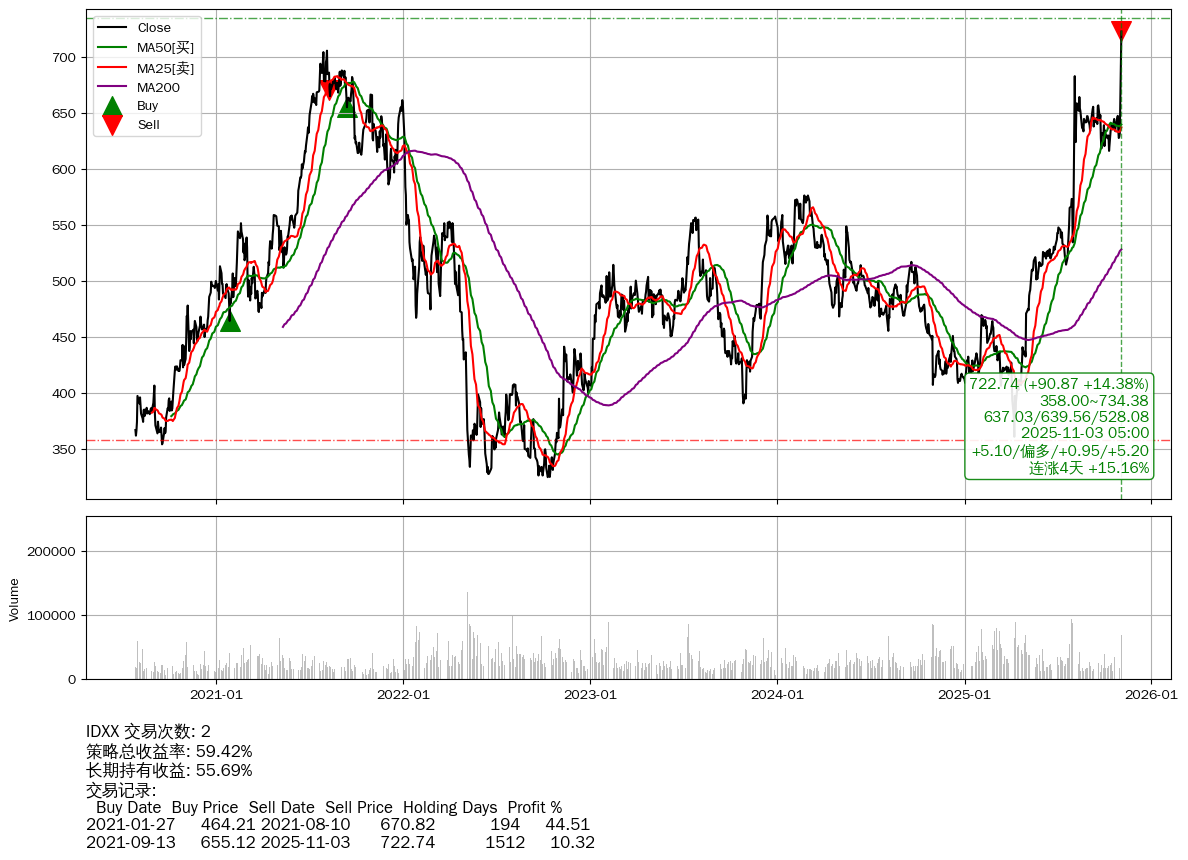 | 36 | 🟢IDXX | $722.33(+91.22 +14.45% 2025-11-03 14:59) | 📈涨破 MA5/10/25/50 均线 📈涨破 52周高点 (734.38) 📈连涨4天 +15.16% | +59.42% | +55.69% | +3.73% | 2 | 偏多/0.95/5.20 | 2020-07-27~2025-11-03 |