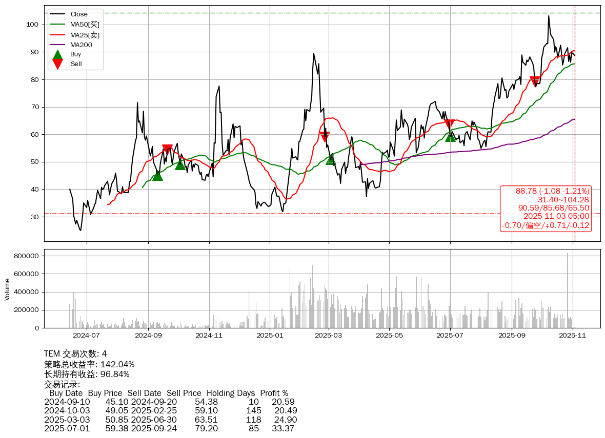 | 20 | ★TEM | $88.67(-1.18 -1.31% 2025-11-03 14:59) | 📉回撤 2025-10-08 -13.95% (25天) 85.26(2025-10-21) → 103.17(2025-10-07) (-17.36%) | +142.04% | +96.84% | +45.20% | 4 | 偏空/0.71/-0.12 | 2024-06-14~2025-11-03 |