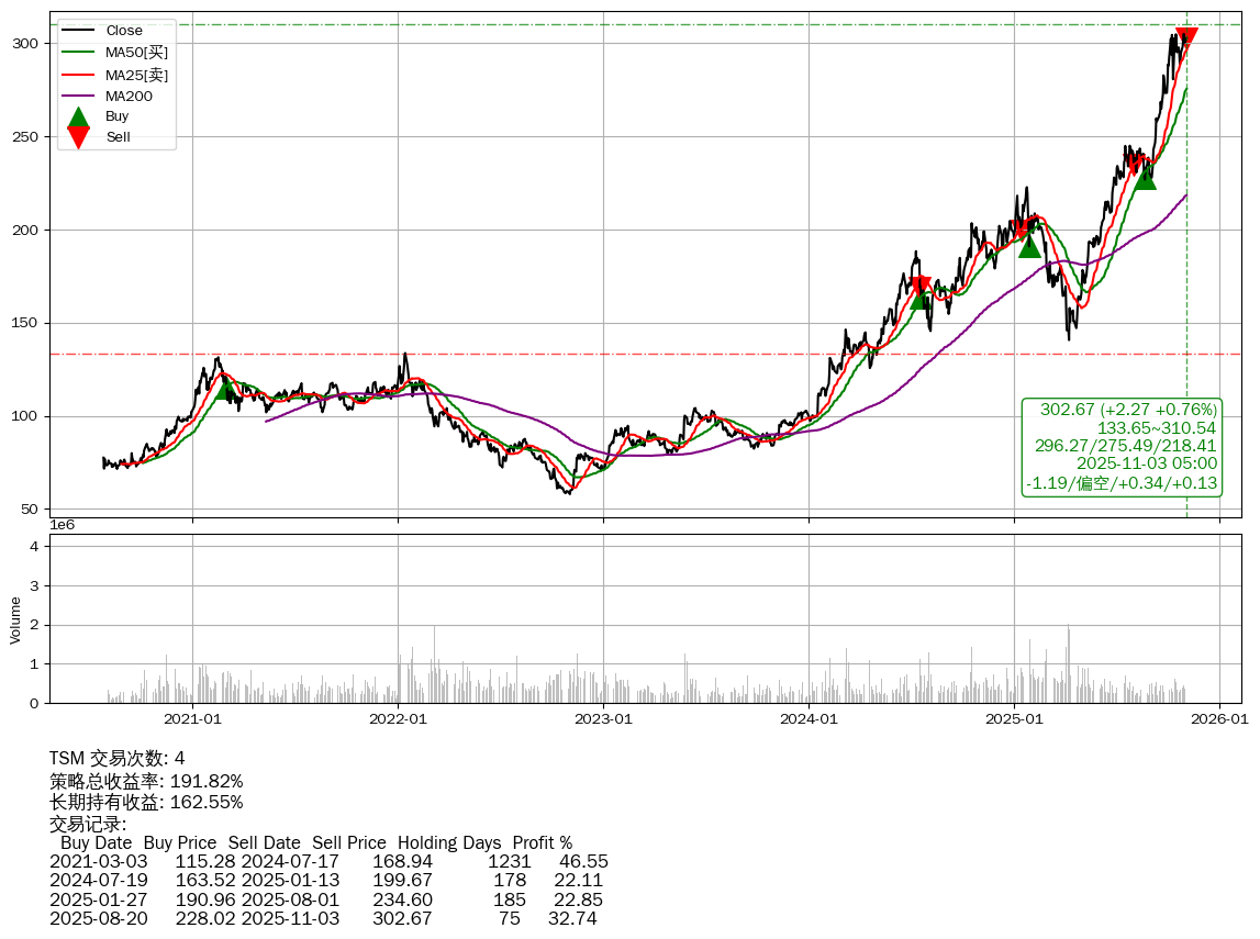 | 14 | 🟢★TSM | $304.81(+4.38 +1.46% 2025-11-03 14:59) | 📈涨破 MA5 均线 📉回撤 2025-10-29 -0.79% (4天) 300.40(2025-10-30) → 305.09(2025-10-28) (-1.54%) | +191.82% | +162.55% | +29.27% | 4 | 偏空/0.34/0.13 | 2020-07-27~2025-11-03 |