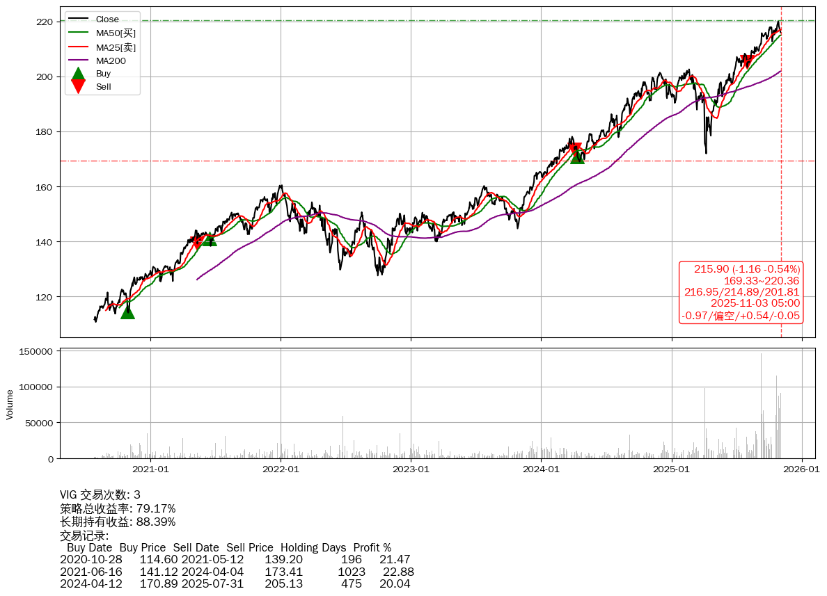| 30 | ★VIG | $215.89(-1.15 -0.53% 2025-11-03 14:59) | 📉跌破 MA25 均线 📉回撤 2025-10-27 -1.85% (6天) 215.90(2025-11-02) → 219.97(2025-10-26) (-1.85%) | +79.17% | +88.39% | -9.22% | 3 | 偏空/0.54/-0.05 | 2020-07-27~2025-11-03 |