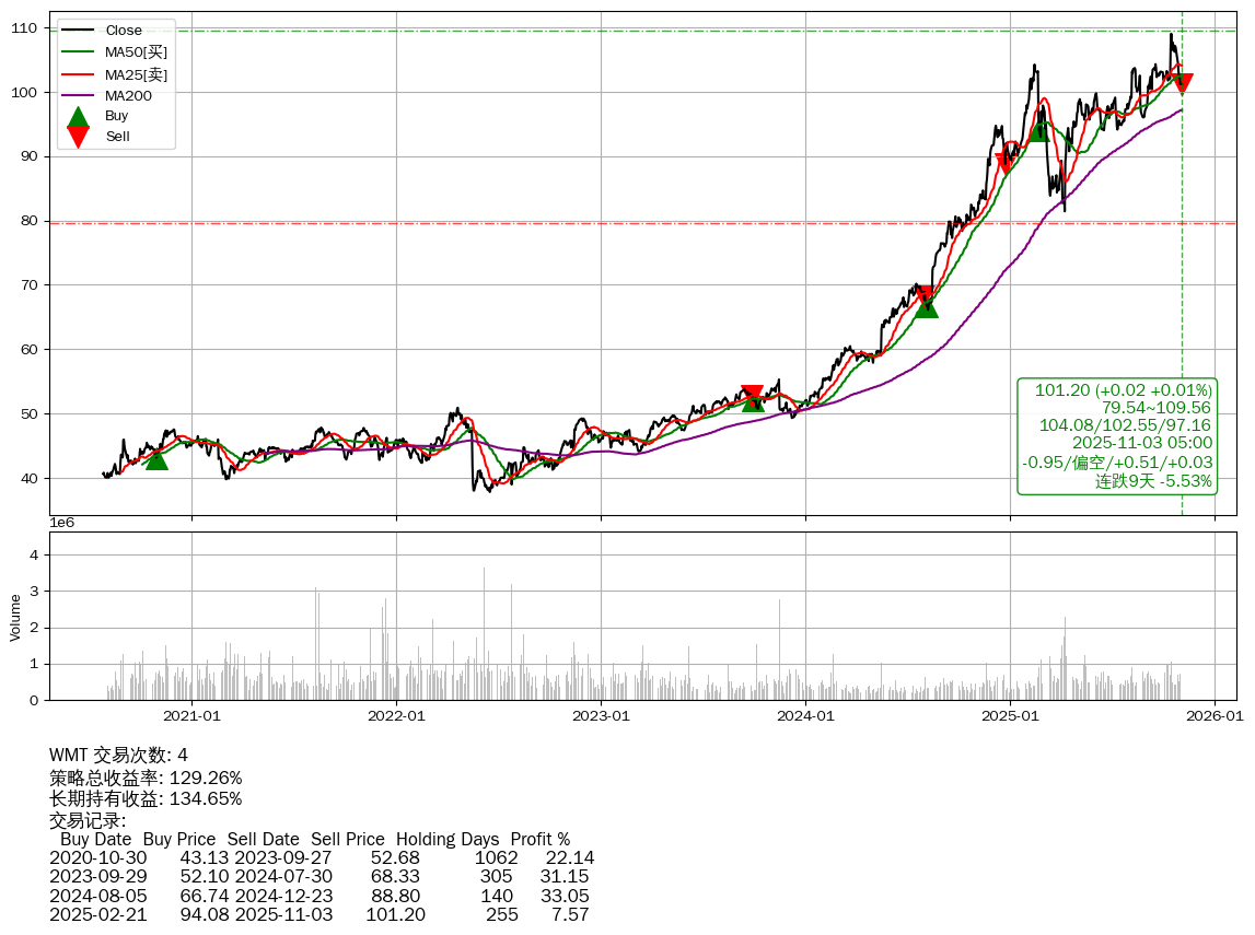 | 21 | ★WMT | $101.60(+0.42 +0.42% 2025-11-03 14:59) | 📉连跌9天 -5.53% 📉回撤 2025-10-15 -7.18% (18天) 101.19(2025-10-30) → 109.03(2025-10-14) (-7.19%) | +129.26% | +134.65% | -5.39% | 4 | 偏空/0.51/0.03 | 2020-07-27~2025-11-03 |