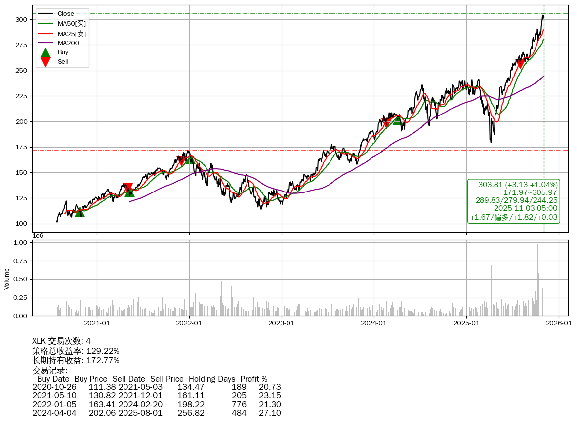 | 22 | ★XLK | $302.01(+1.43 +0.48% 2025-11-03 14:59) | 📈涨破 MA5 均线 📉回撤 2025-10-29 -0.11% (4天) 300.50(2025-10-29) → 304.15(2025-10-28) (-1.20%) | +129.22% | +172.77% | -43.55% | 4 | 偏多/1.82/0.03 | 2020-07-27~2025-11-03 |