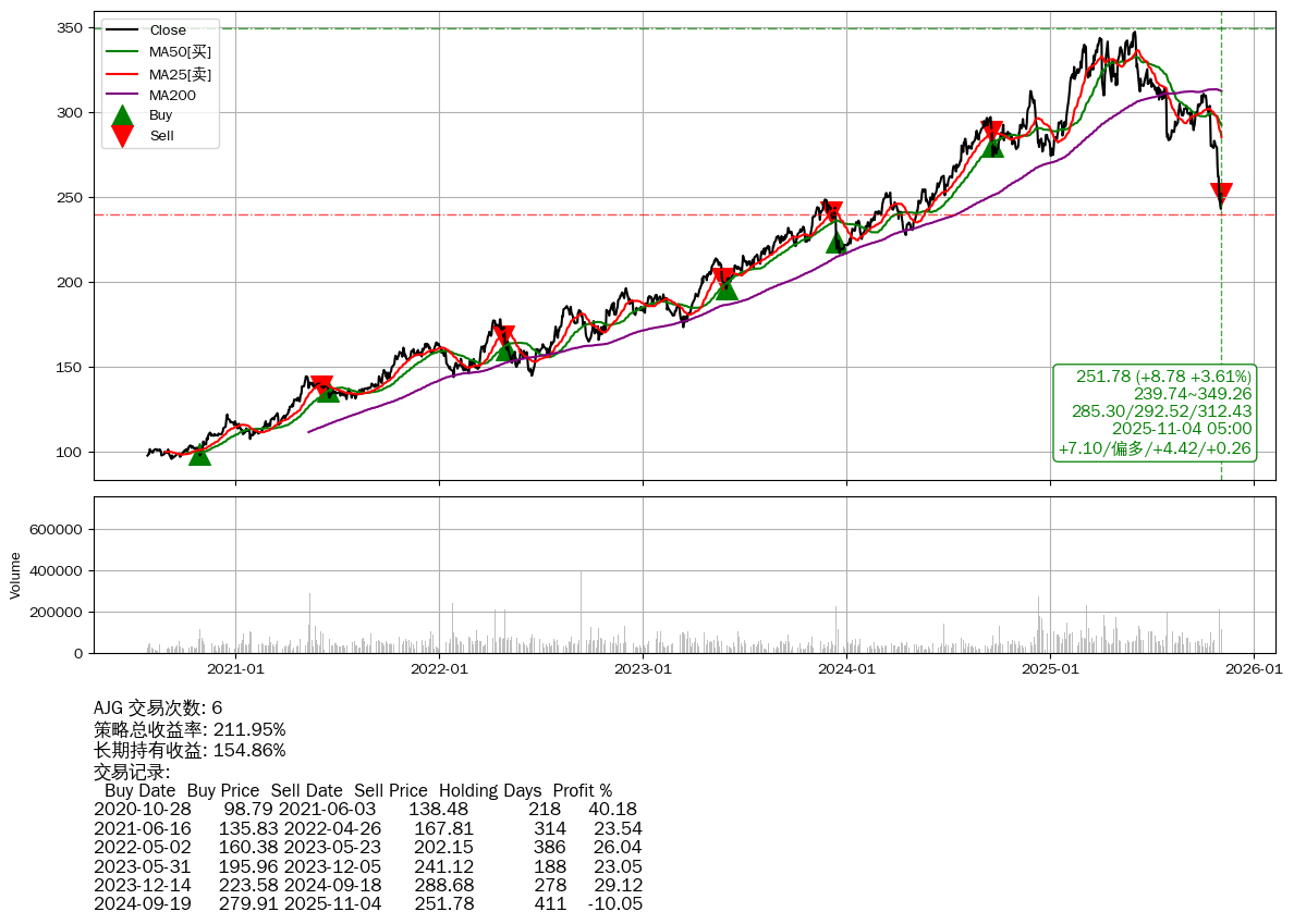 | 14 | AJG | $251.79(+8.79 +3.62% 2025-11-04 14:59) | 📉回撤 2025-06-02 -27.51% (154天) 243.00(2025-11-02) → 347.34(2025-06-01) (-30.04%) | +211.95% | +154.86% | +57.08% | 6 | 偏多/4.42/0.26 | 2020-07-27~2025-11-04 |