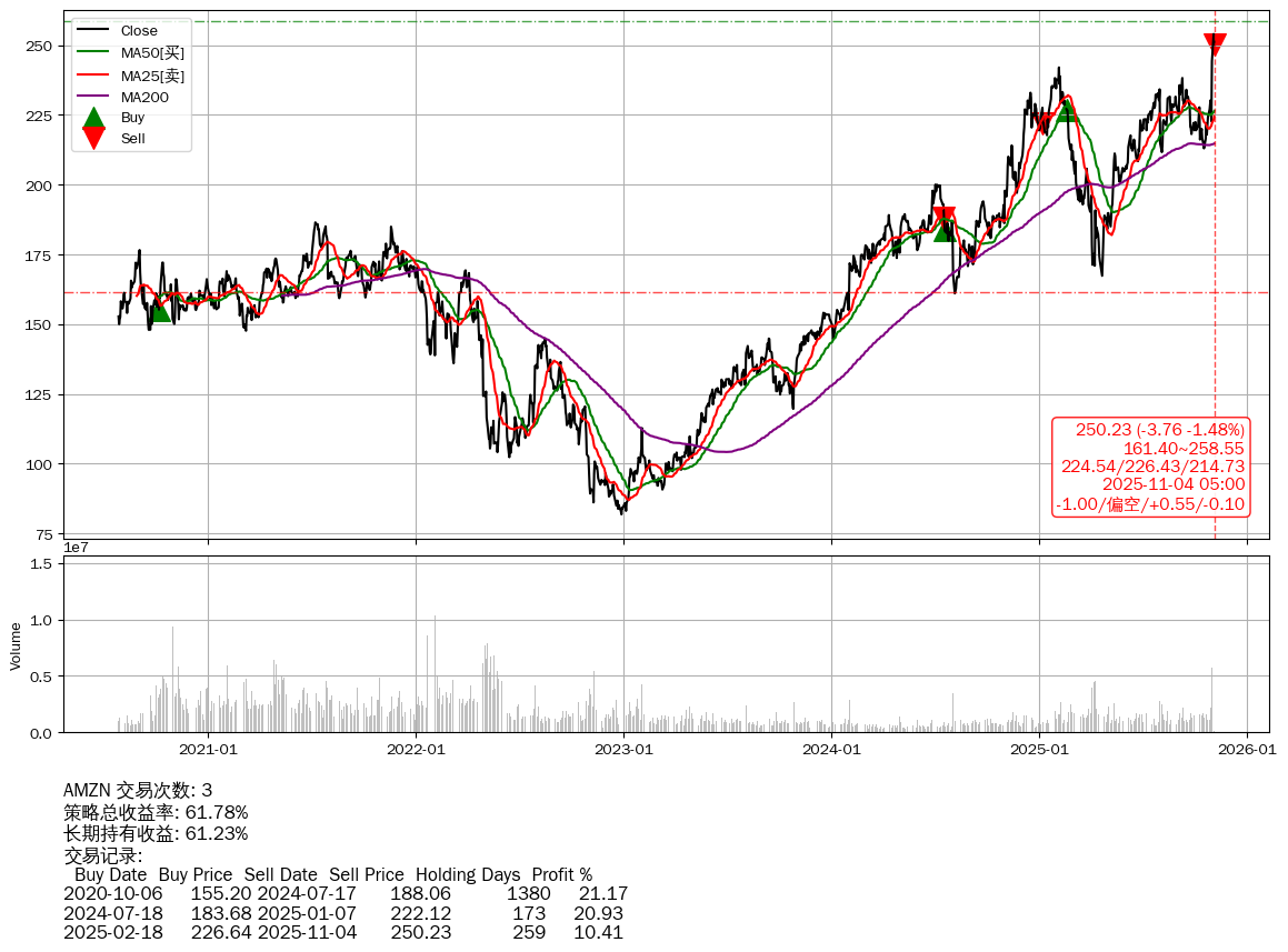 | 40 | ★AMZN | $249.43(-4.63 -1.82% 2025-11-04 14:59) | 📉回撤 2025-11-03 -1.48% (0天) 250.23(2025-11-03) → 253.99(2025-11-02) (-1.48%) | +61.78% | +61.23% | +0.55% | 3 | 偏空/0.55/-0.10 | 2020-07-27~2025-11-04 |