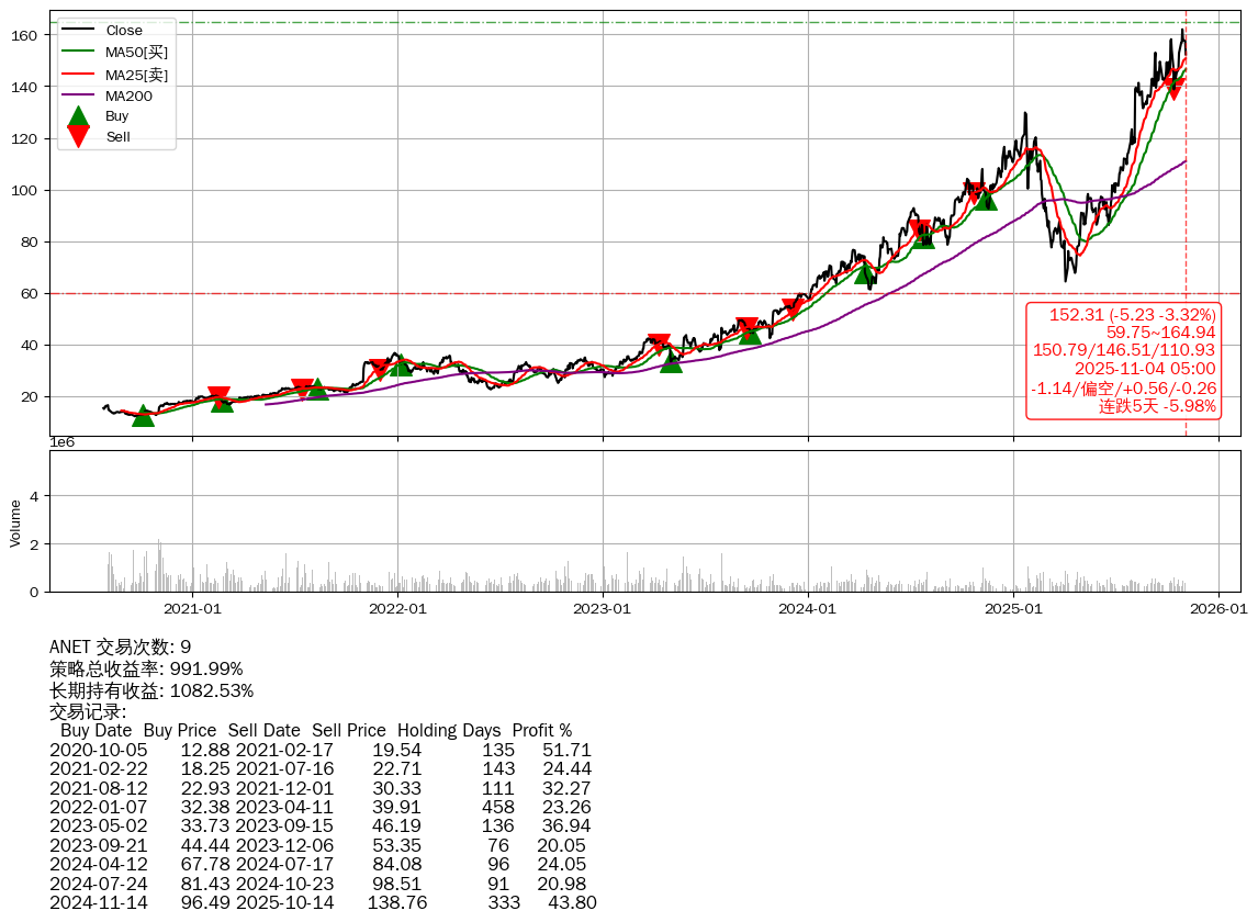 | 2 | ★ANET | $153.58(-4.03 -2.56% 2025-11-04 14:59) | 📉跌破 MA10 均线 📉连跌5天 -5.98% 📉回撤 2025-10-29 -5.98% (5天) 152.31(2025-11-03) → 161.99(2025-10-28) (-5.98%) | +991.99% | +1082.53% | -90.54% | 9 | 偏空/0.56/-0.26 | 2020-07-27~2025-11-04 |