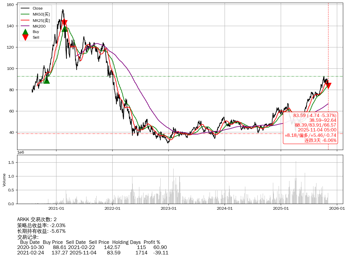 | 46 | ★ARKK | $83.60(-4.74 -5.37% 2025-11-04 14:59) | 📉跌破 MA5/10/50 均线 📉连跌3天 -6.06% 📉回撤 2021-02-15 -46.16% (1722天) 29.66(2022-12-27) → 155.27(2021-02-11) (-80.90%) | -2.03% | -5.67% | +3.64% | 2 | 偏多/5.46/-0.74 | 2020-07-27~2025-11-04 |