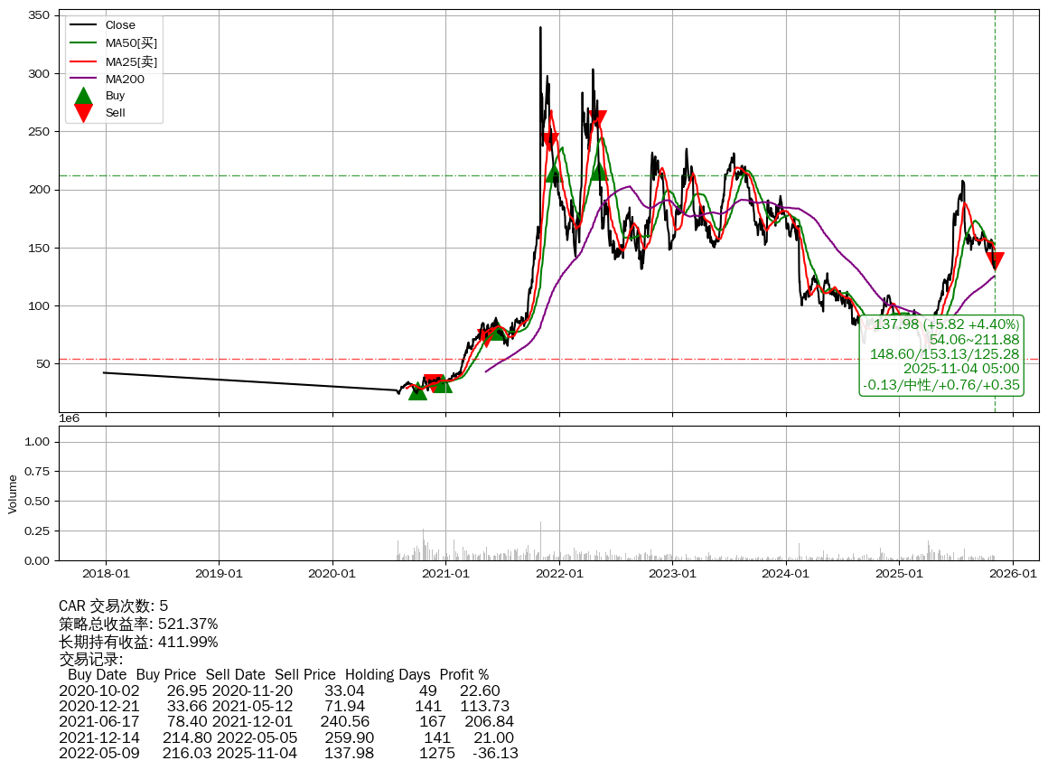 | 5 | CAR | $137.97(+5.63 +4.25% 2025-11-04 14:59) | 📈涨破 MA5 均线 📉回撤 2021-11-02 -59.37% (1462天) 55.22(2025-03-12) → 339.56(2021-11-01) (-83.74%) | +521.37% | +411.99% | +109.38% | 5 | 中性/0.76/0.35 | 2017-12-26~2025-11-04 |