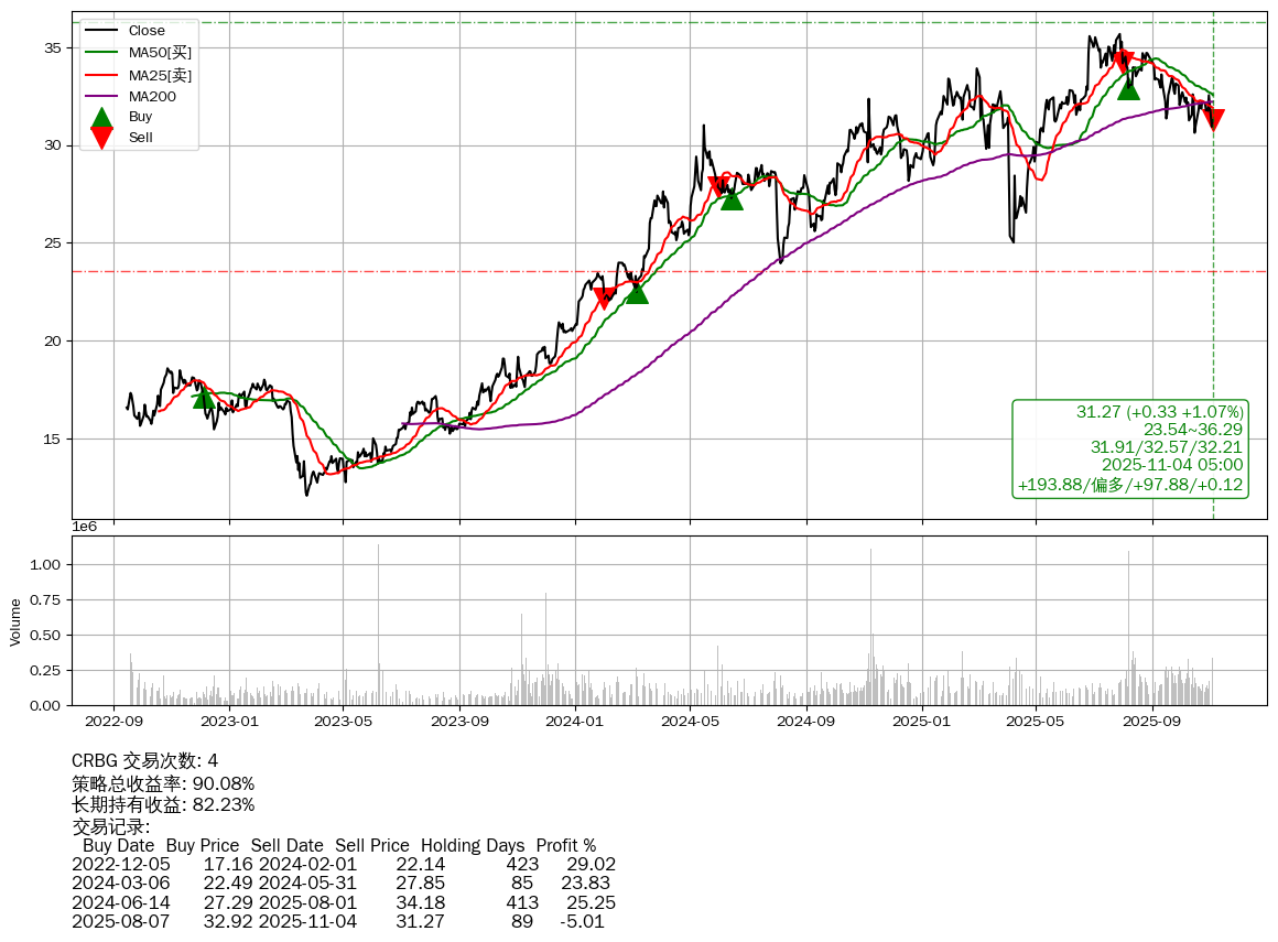 | 34 | CRBG | $31.27(+0.33 +1.07% 2025-11-04 14:59) | 📉回撤 2025-07-29 -12.36% (97天) 30.63(2025-10-15) → 35.68(2025-07-28) (-14.15%) | +90.08% | +82.23% | +7.85% | 4 | 偏多/97.88/0.12 | 2022-09-15~2025-11-04 |