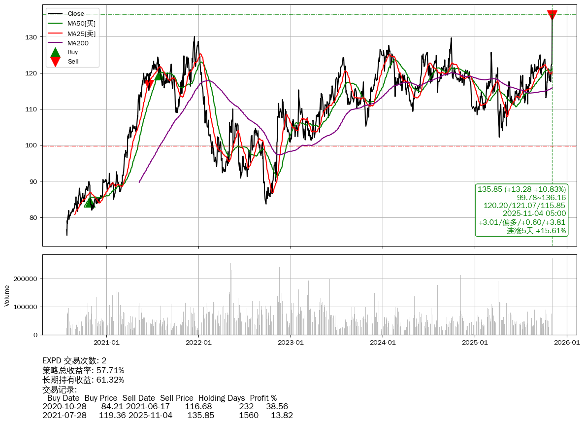 | 42 | EXPD | $135.81(+13.25 +10.81% 2025-11-04 14:59) | 📈涨破 MA5 均线 📈涨破 52周高点 (136.16) 📈连涨5天 +15.61% | +57.71% | +61.32% | -3.61% | 2 | 偏多/0.6/3.81 | 2020-07-27~2025-11-04 |
