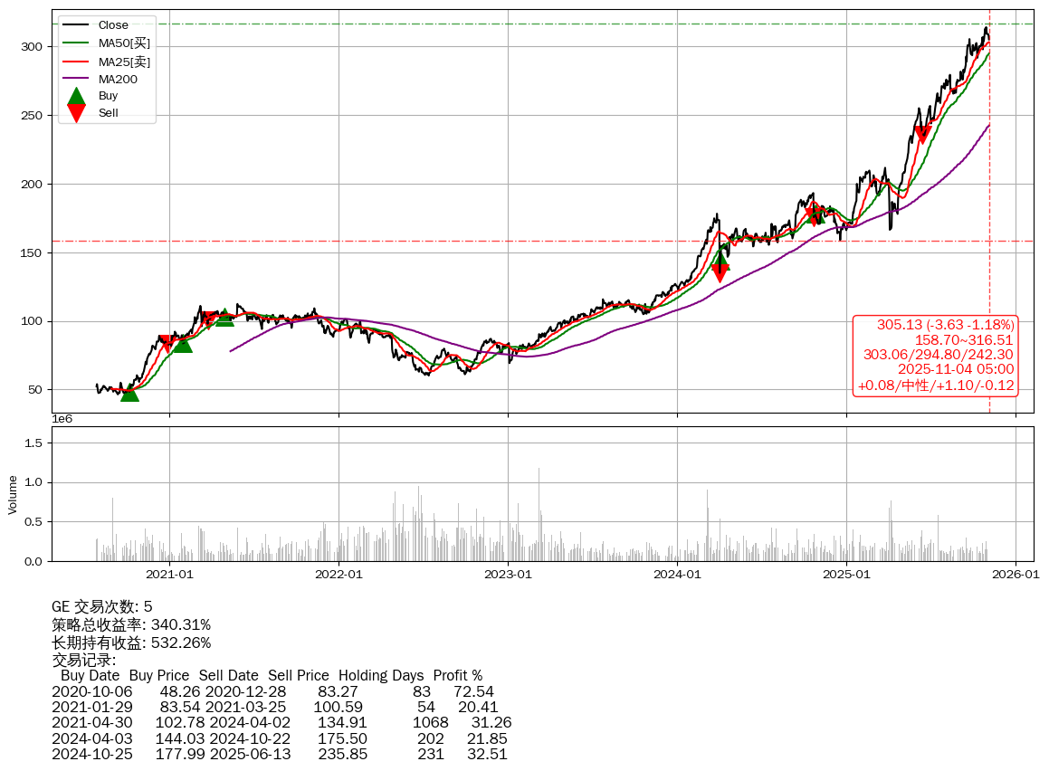 | 8 | ★GE | $304.26(-4.44 -1.44% 2025-11-04 14:59) | 📉跌破 MA10 均线 📉回撤 2025-10-29 -2.84% (5天) 305.13(2025-11-03) → 314.04(2025-10-28) (-2.84%) | +340.31% | +532.26% | -191.95% | 5 | 中性/1.1/-0.12 | 2020-07-27~2025-11-04 |