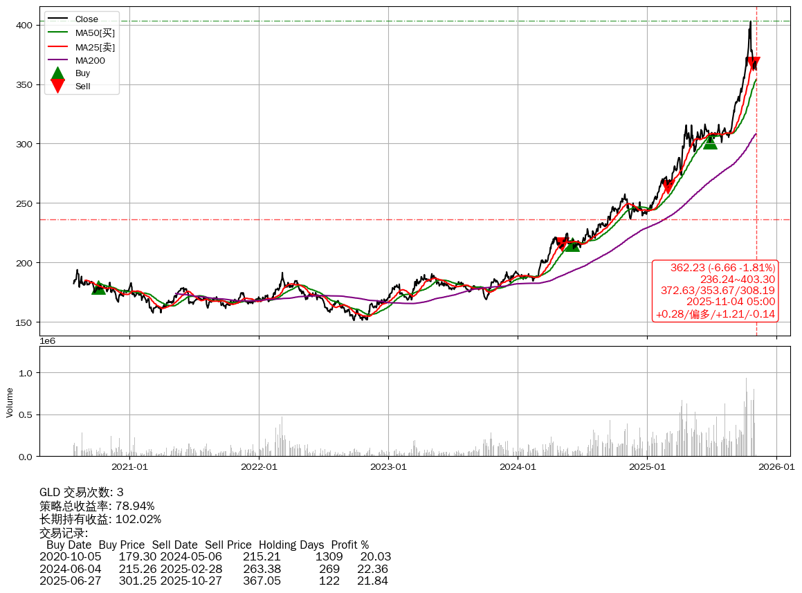 | 37 | ★GLD | $362.35(-6.52 -1.77% 2025-11-04 14:59) | 📉跌破 MA5 均线 📉回撤 2025-10-20 -10.11% (14天) 362.23(2025-11-03) → 402.95(2025-10-19) (-10.11%) | +78.94% | +102.02% | -23.08% | 3 | 偏多/1.21/-0.14 | 2020-07-27~2025-11-04 |