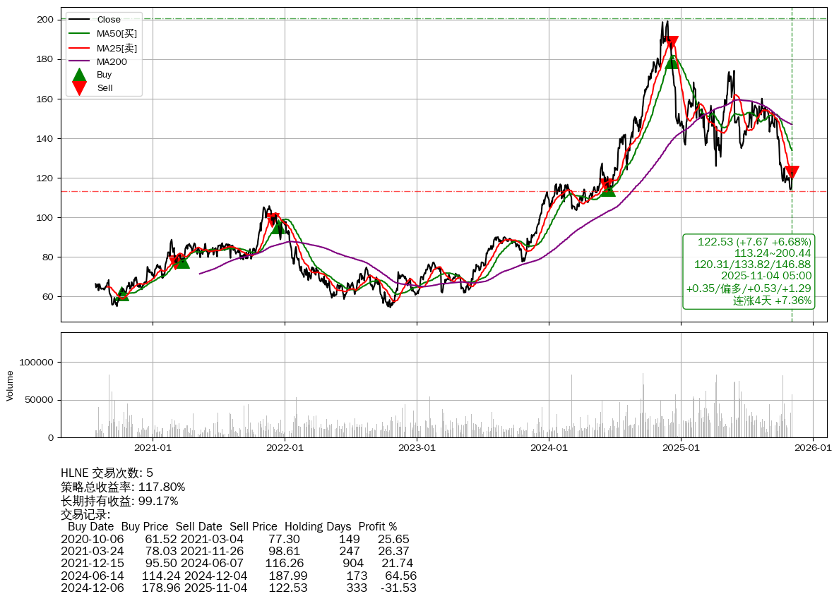 | 31 | HLNE | $122.32(+7.37 +6.41% 2025-11-04 14:59) | 📈涨破 MA5/10/25 均线 📈连涨4天 +7.36% 📉回撤 2024-11-25 -38.47% (343天) 113.98(2025-10-30) → 199.13(2024-11-24) (-42.76%) | +117.80% | +99.17% | +18.63% | 5 | 偏多/0.53/1.29 | 2020-07-27~2025-11-04 |
