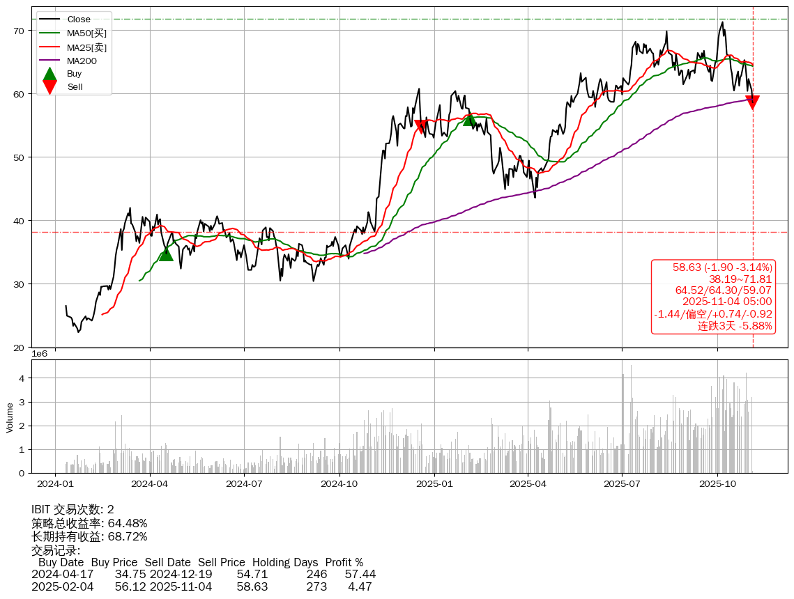| 39 | ★IBIT | $57.15(-3.39 -5.60% 2025-11-04 14:59) | 📉跌破 MA200 均线 📉连跌3天 -5.88% 📉回撤 2025-10-06 -17.76% (28天) 58.63(2025-11-03) → 71.29(2025-10-05) (-17.76%) | +64.48% | +68.72% | -4.24% | 2 | 偏空/0.74/-0.92 | 2024-01-11~2025-11-04 |