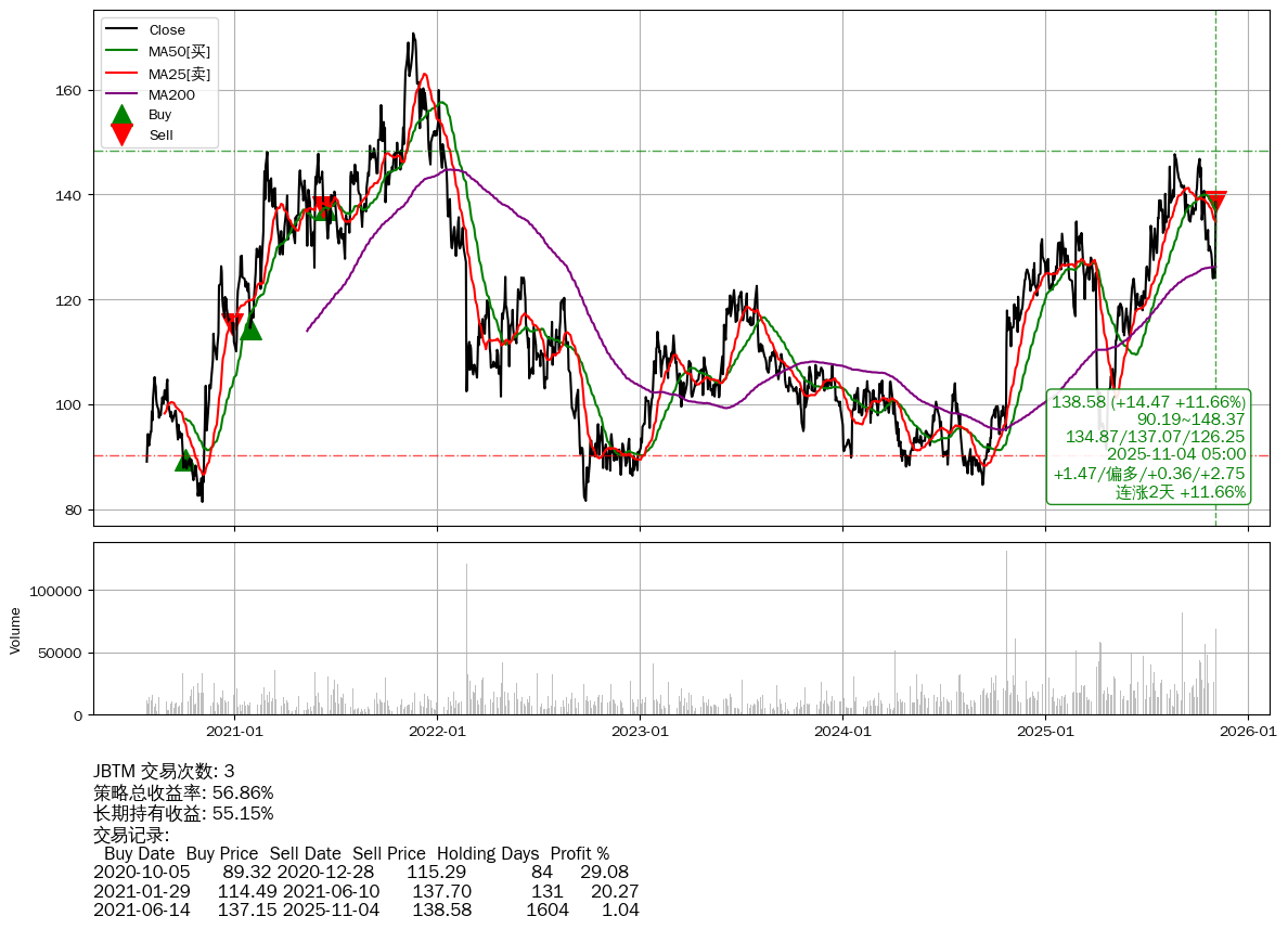 | 43 | JBTM | $138.31(+13.65 +10.95% 2025-11-04 14:59) | 📈涨破 MA5/10/25/50/100/200 均线 📈连涨2天 +11.66% 📉回撤 2021-11-21 -18.86% (1443天) 81.56(2022-09-25) → 170.79(2021-11-18) (-52.25%) | +56.86% | +55.15% | +1.71% | 3 | 偏多/0.36/2.75 | 2020-07-27~2025-11-04 |