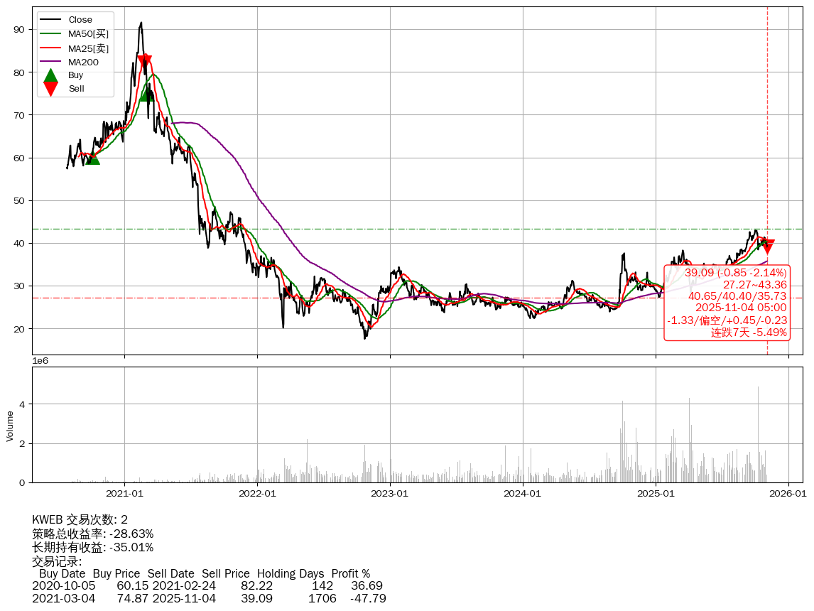 | 48 | ★KWEB | $39.06(-0.90 -2.25% 2025-11-04 14:59) | 📉连跌7天 -5.49% 📉回撤 2021-02-17 -57.33% (1720天) 17.53(2022-10-23) → 91.60(2021-02-16) (-80.86%) | -28.63% | -35.01% | +6.38% | 2 | 偏空/0.45/-0.23 | 2020-07-27~2025-11-04 |
