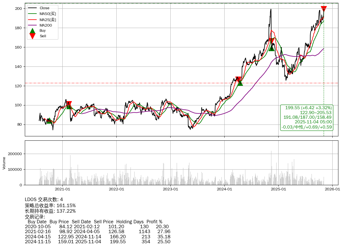 | 22 | LDOS | $199.57(+6.46 +3.35% 2025-11-04 14:59) | 📈涨破 52周高点 (205.53) | +161.15% | +137.22% | +23.93% | 4 | 中性/0.69/0.59 | 2020-07-27~2025-11-04 |