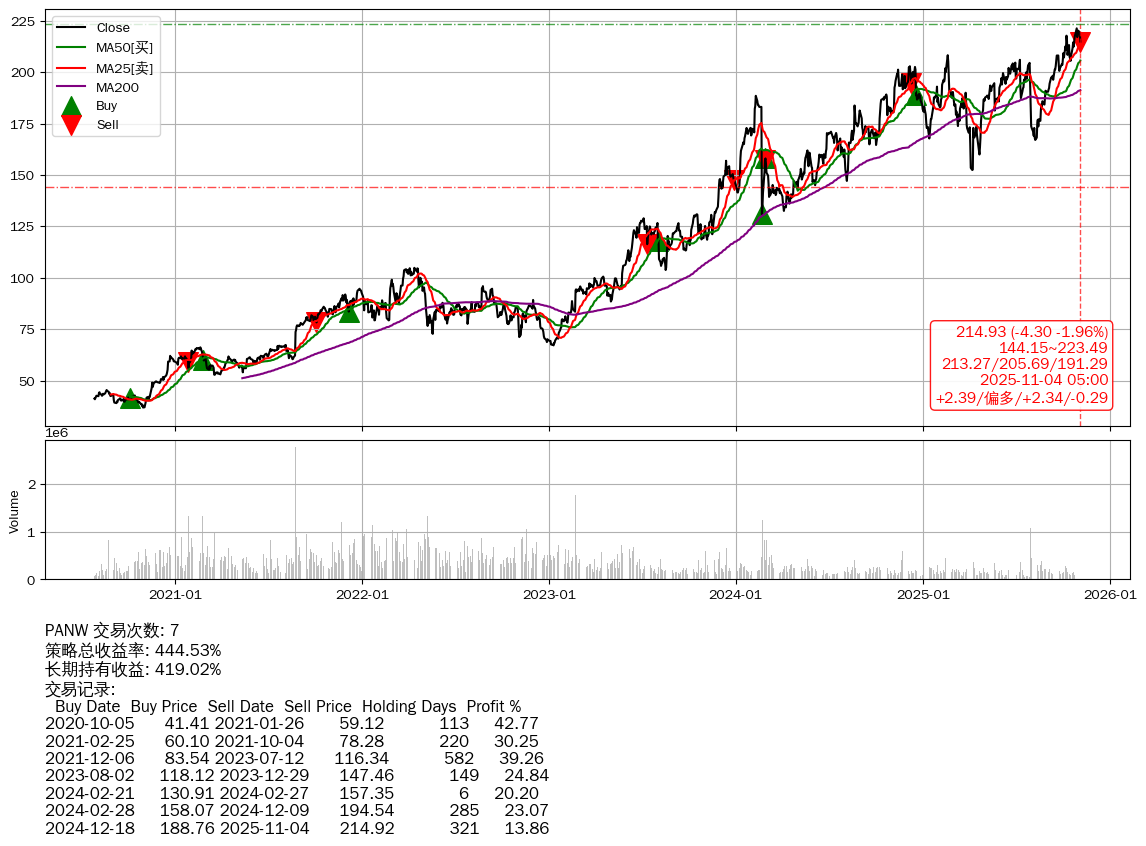 | 6 | ★PANW | $214.56(-4.68 -2.13% 2025-11-04 14:59) | 📉跌破 MA5/10 均线 📉回撤 2025-10-28 -2.90% (6天) 214.93(2025-11-03) → 221.34(2025-10-27) (-2.90%) | +444.53% | +419.02% | +25.51% | 7 | 偏多/2.34/-0.29 | 2020-07-27~2025-11-04 |