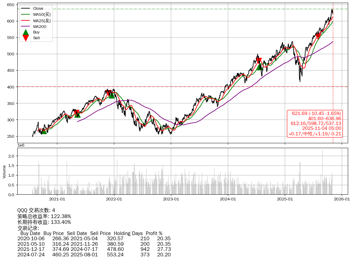 | 27 | ★QQQ | $619.22(-12.84 -2.03% 2025-11-04 14:59) | 📉跌破 MA5/10 均线 📉回撤 2025-10-29 -2.23% (5天) 621.69(2025-11-03) → 635.87(2025-10-28) (-2.23%) | +122.38% | +133.40% | -11.03% | 4 | 中性/1.2/-0.21 | 2020-07-27~2025-11-04 |