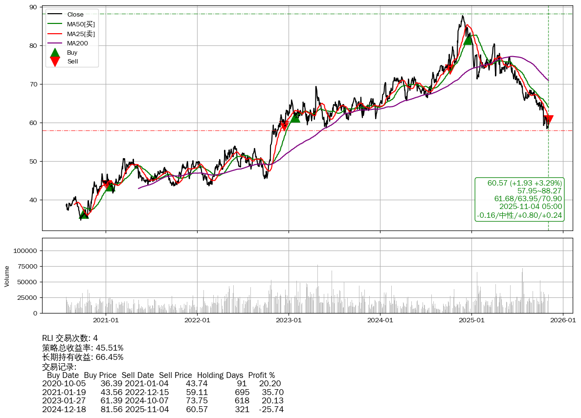 | 44 | RLI | $60.57(+1.89 +3.22% 2025-11-04 14:59) | 📈涨破 MA5/10 均线 📉回撤 2024-11-26 -30.97% (342天) 58.39(2025-10-28) → 87.74(2024-11-25) (-33.45%) | +45.51% | +66.45% | -20.94% | 4 | 中性/0.8/0.24 | 2020-07-27~2025-11-04 |
