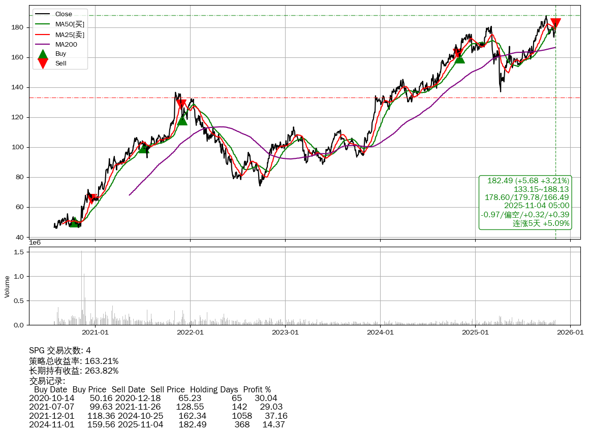 | 21 | SPG | $182.68(+5.91 +3.34% 2025-11-04 14:59) | 📈涨破 MA10/25/50 均线 📈连涨5天 +5.09% 📉回撤 2025-09-30 -2.80% (34天) 173.35(2025-10-29) → 187.75(2025-09-29) (-7.67%) | +163.21% | +263.82% | -100.60% | 4 | 偏空/0.32/0.39 | 2020-07-27~2025-11-04 |