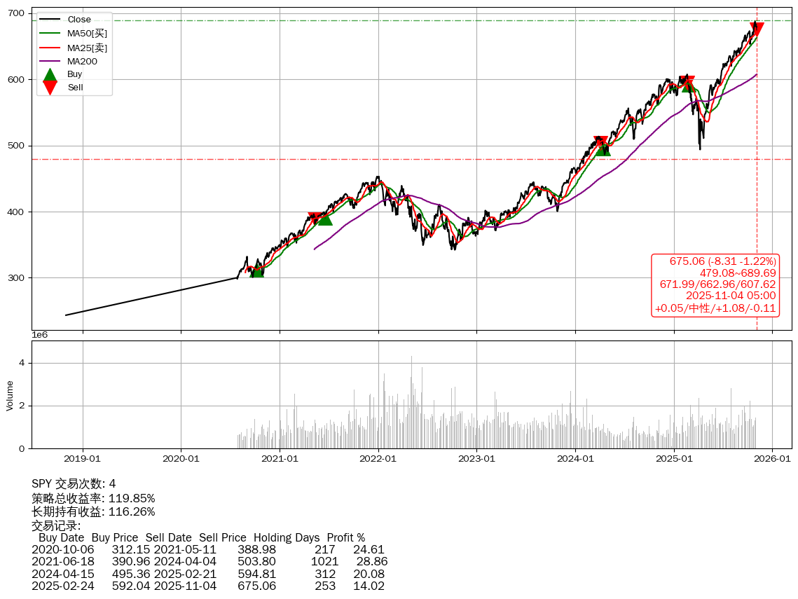 | 29 | ★SPY | $675.34(-8.03 -1.18% 2025-11-04 14:59) | 📉跌破 MA5/10 均线 📉回撤 2025-10-29 -1.78% (5天) 675.06(2025-11-03) → 687.32(2025-10-28) (-1.78%) | +119.85% | +116.26% | +3.59% | 4 | 中性/1.08/-0.11 | 2018-11-01~2025-11-04 |