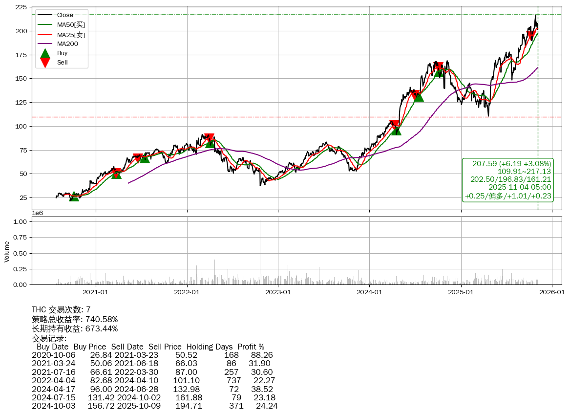 | 3 | THC | $207.57(+6.14 +3.05% 2025-11-04 14:59) | 📈涨破 MA5/25 均线 📉回撤 2025-10-27 -3.95% (7天) 201.40(2025-11-02) → 216.13(2025-10-26) (-6.82%) | +740.58% | +673.44% | +67.15% | 7 | 偏多/1.01/0.23 | 2020-07-27~2025-11-04 |