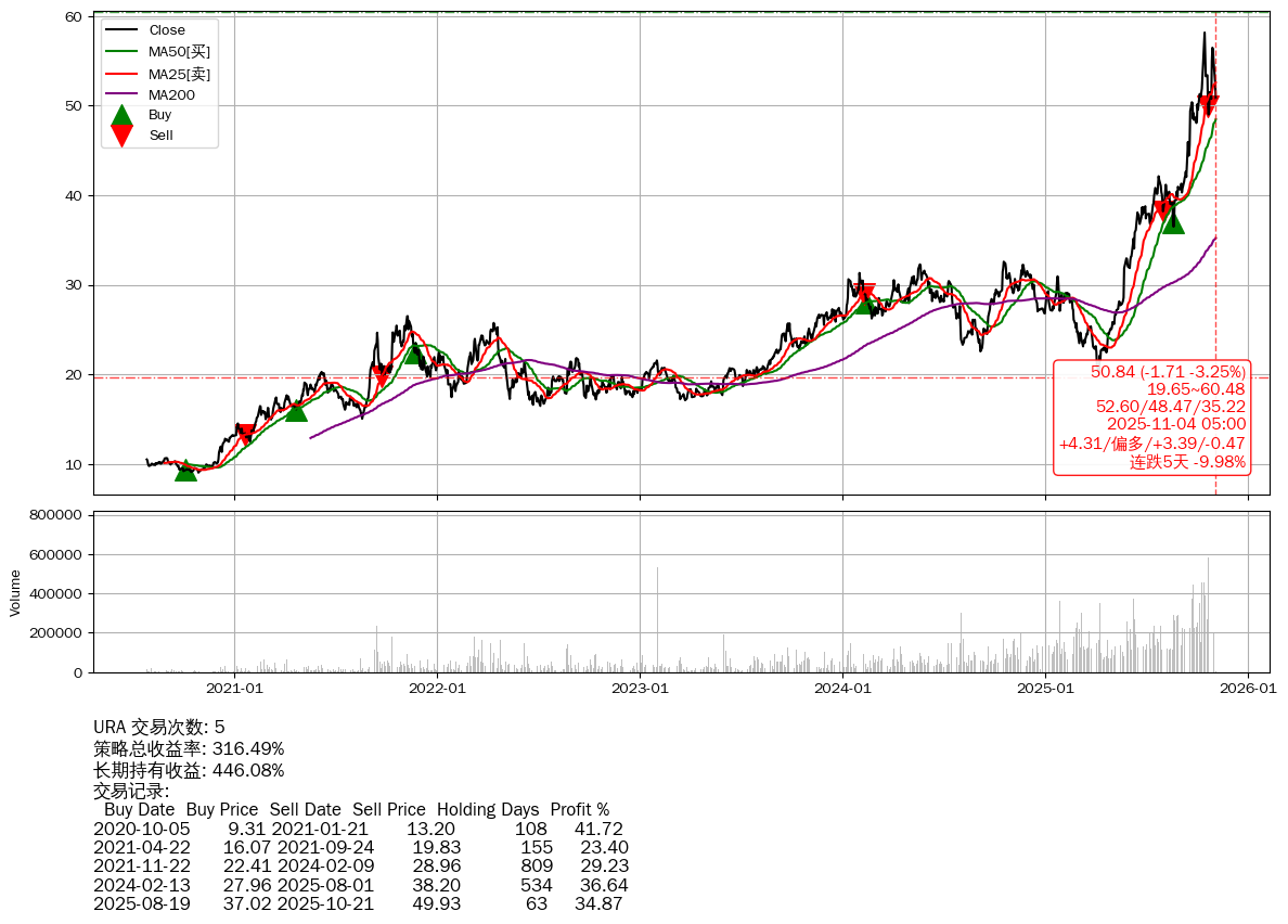 | 9 | ★URA | $49.74(-2.81 -5.35% 2025-11-04 14:59) | 📉连跌5天 -9.98% 📉回撤 2025-10-15 -12.60% (19天) 49.02(2025-10-21) → 58.17(2025-10-14) (-15.73%) | +316.49% | +446.08% | -129.59% | 5 | 偏多/3.39/-0.47 | 2020-07-27~2025-11-04 |