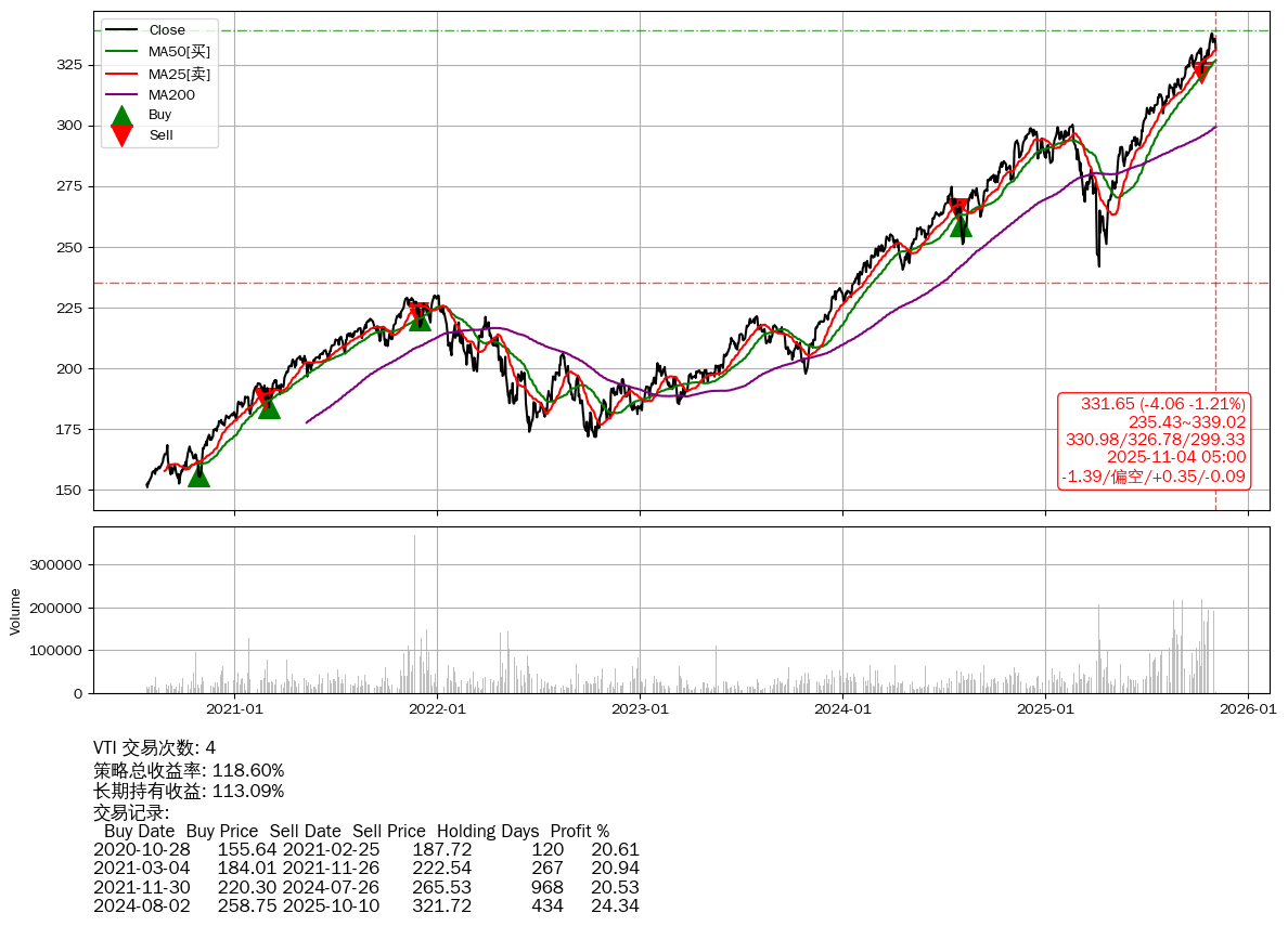 | 30 | ★VTI | $331.71(-4.12 -1.23% 2025-11-04 14:59) | 📉跌破 MA5/10 均线 📉回撤 2025-10-28 -1.85% (6天) 331.65(2025-11-03) → 337.90(2025-10-27) (-1.85%) | +118.60% | +113.09% | +5.52% | 4 | 偏空/0.35/-0.09 | 2020-07-27~2025-11-04 |
