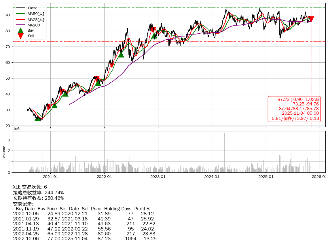| 12 | ★XLE | $87.18(-0.95 -1.08% 2025-11-04 14:59) | 📉跌破 MA5/10/25 均线 📉回撤 2024-11-24 -7.32% (344天) 75.19(2025-04-07) → 94.12(2024-11-21) (-20.11%) | +244.74% | +250.46% | -5.72% | 6 | 偏多/3.97/-0.13 | 2020-07-27~2025-11-04 |