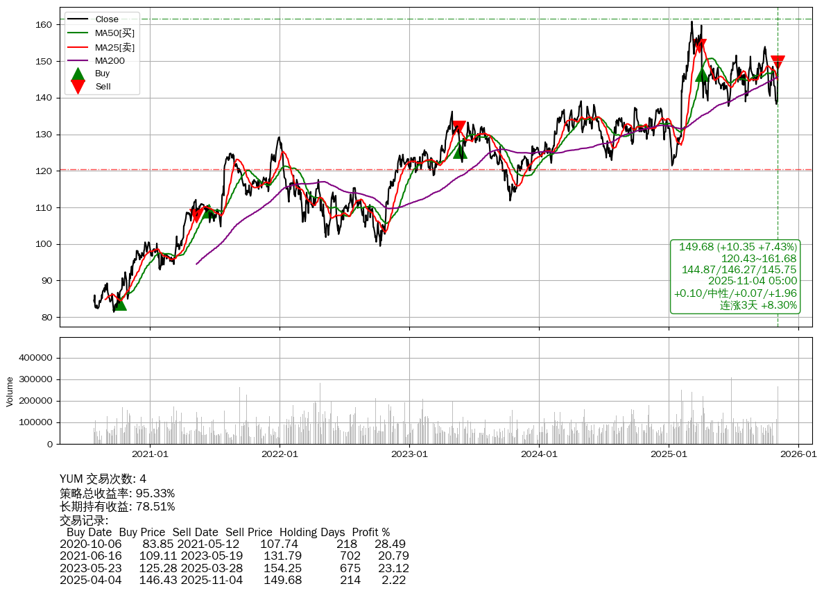 | 33 | YUM | $149.59(+10.28 +7.38% 2025-11-04 14:59) | 📈涨破 MA5/10/25/50/100/200 均线 📈连涨3天 +8.30% 📉回撤 2025-03-09 -6.95% (239天) 137.68(2025-06-17) → 160.86(2025-03-06) (-14.41%) | +95.33% | +78.51% | +16.82% | 4 | 中性/0.07/1.96 | 2020-07-27~2025-11-04 |