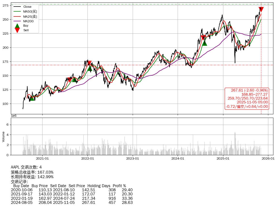 | 16 | ★AAPL | $270.11(-0.10 -0.04% 2025-11-05 14:59) | 📉跌破 MA5/10 均线 📉回撤 2025-10-30 -1.37% (5天) 267.61(2025-11-04) → 271.32(2025-10-29) (-1.37%) | +167.03% | +142.99% | +24.04% | 4 | 偏空/0.64/0.00 | 2020-07-27~2025-11-05 |