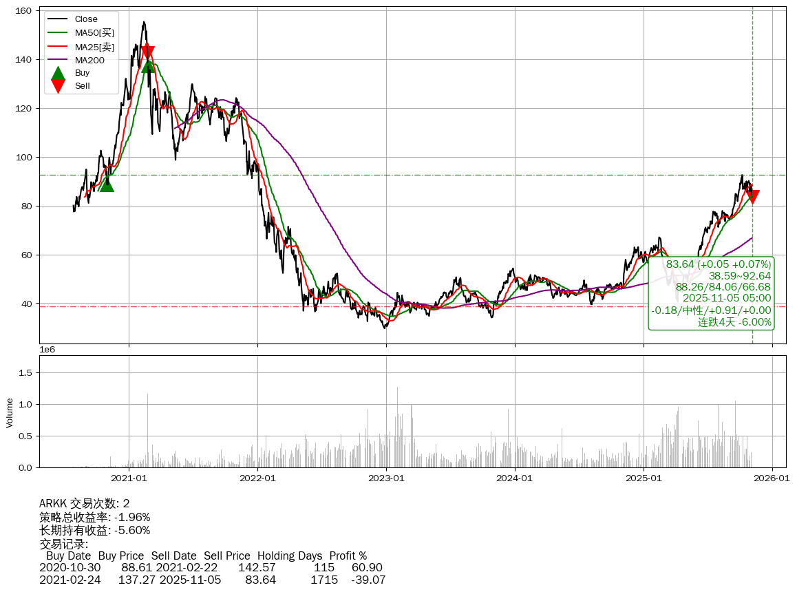 | 38 | 🟢★ARKK | $84.93(+1.33 +1.59% 2025-11-05 14:59) | 📉连跌4天 -6.00% 📉回撤 2021-02-15 -46.13% (1723天) 29.66(2022-12-27) → 155.27(2021-02-11) (-80.90%) | -1.96% | -5.60% | +3.64% | 2 | 中性/0.91/0.00 | 2020-07-27~2025-11-05 |