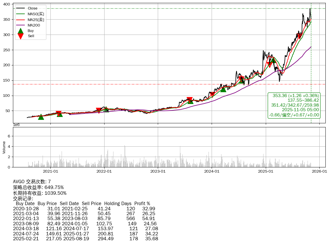 | 3 | ★AVGO | $358.87(+6.52 +1.85% 2025-11-05 14:59) | 📉回撤 2025-10-29 -8.44% (6天) 352.10(2025-11-03) → 385.92(2025-10-28) (-8.76%) | +649.75% | +1039.50% | -389.75% | 7 | 偏空/0.67/0.00 | 2020-07-27~2025-11-05 |