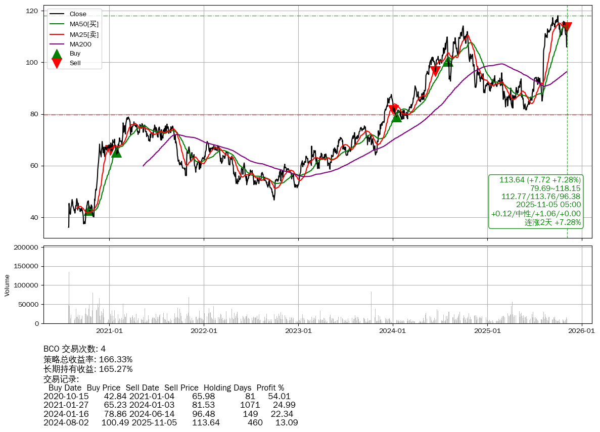 | 17 | 🟢BCO | $113.99(+8.12 +7.67% 2025-11-05 14:59) | 📈涨破 MA5/10/25 均线 📈连涨2天 +7.28% 📉回撤 2025-10-01 -3.77% (34天) 105.92(2025-11-03) → 118.09(2025-09-30) (-10.30%) | +166.33% | +165.27% | +1.06% | 4 | 中性/1.06/0.00 | 2020-07-27~2025-11-05 |