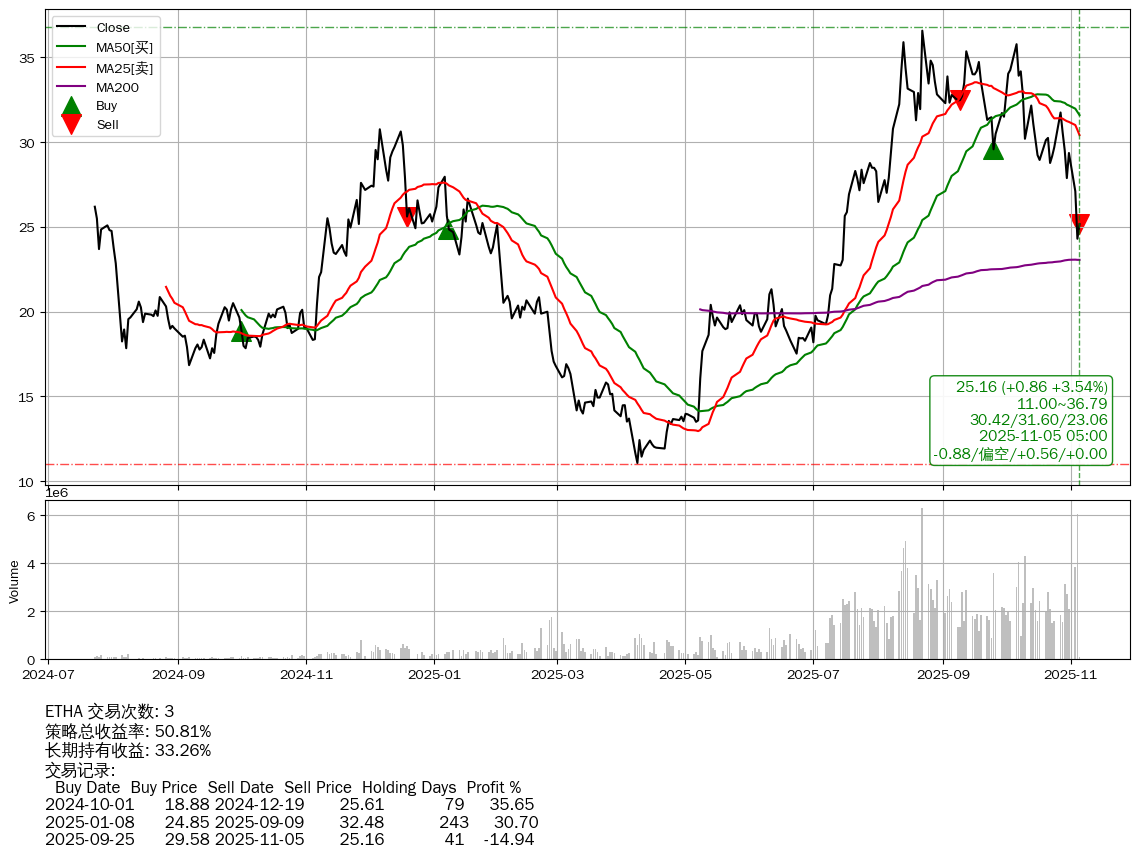 | 36 | ★ETHA | $26.09(+1.79 +7.37% 2025-11-05 14:59) | 📉回撤 2025-08-24 -31.22% (72天) 24.30(2025-11-03) → 36.58(2025-08-21) (-33.57%) | +50.81% | +33.26% | +17.54% | 3 | 偏空/0.56/0.00 | 2024-07-23~2025-11-05 |