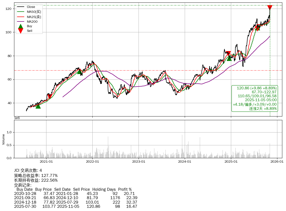 | 23 | 🟢JCI | $120.83(+9.80 +8.83% 2025-11-05 14:59) | 📈涨破 MA5/10 均线 📈涨破 52周高点 (122.97) 📈连涨2天 +8.89% | +127.77% | +222.56% | -94.80% | 4 | 偏多/3.09/0.00 | 2020-07-27~2025-11-05 |