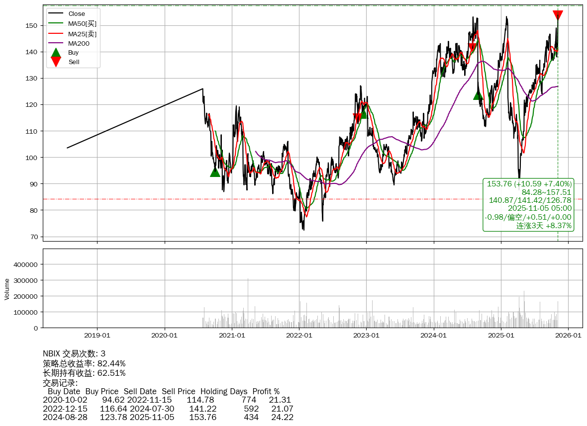 | 30 | 🟢NBIX | $153.71(+10.46 +7.30% 2025-11-05 14:59) | 📈涨破 MA5/10 均线 📈涨破 52周高点 (157.51) 📈连涨3天 +8.37% | +82.44% | +62.51% | +19.93% | 3 | 偏空/0.51/0.00 | 2018-07-23~2025-11-05 |